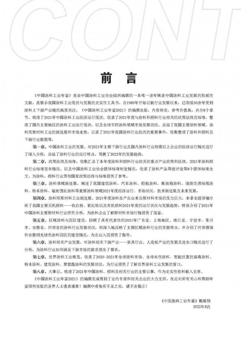 《中國涂料工業年鑒2021》共分7個章節,總結了2021年中國涂料工業經濟運行現狀,收錄了2021年度與涂料和顏料行業相關的政策法規及標準,闡述了我國涂料細分領域2021年度經濟運行、市場狀況、技術新進展及未來發展,整理了國內主要地區的涂料工業運行及園區建設現狀,以及全球不同涂料領域市場發展狀況,總結了我國主要涂料用原材料工業的新進展和市場走勢,記錄了2021年我國涂料行業經歷的重要事件等。