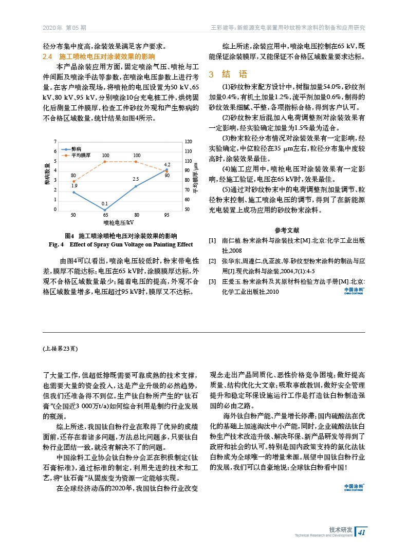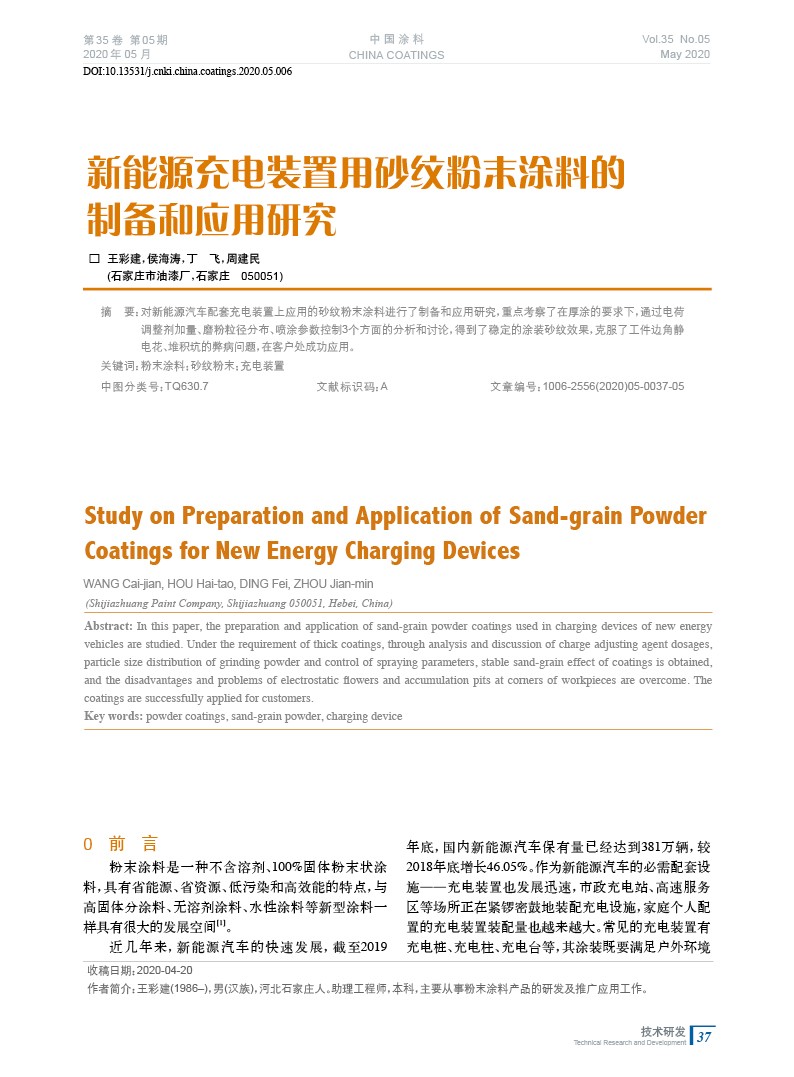 對新能源汽車配套充電裝置上應用的砂紋粉末涂料進行了制備和應用研究,重點考察了在厚涂的要求下,通過電荷調整劑加量、磨粉粒徑分布、噴涂參數控制3個方面的分析和討論,得到了穩定的涂裝砂紋效果,克服了工件邊角靜電花、堆積坑的弊病問題,在客戶處成功應用。