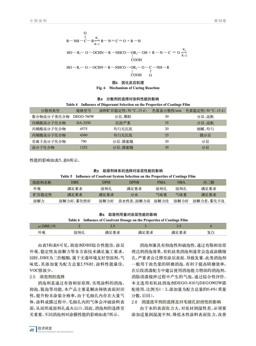 摘要:介紹了一種應(yīng)用于機(jī)電鑄鐵件的水性聚氨酯封閉烤漆,實(shí)現(xiàn)了與粉末涂料涂層的配套,重點(diǎn)闡述了該涂料的制備工藝,探討了各種樹(shù)脂與固化劑的搭配、功能助劑、助溶劑對(duì)涂膜性能及配套性的影響。通過(guò)電鏡分析對(duì)比,產(chǎn)品對(duì)鑄鐵毛細(xì)孔封閉性佳,有效解決了水性涂層與粉末涂層的厚涂涂裝爆泡難題及柔韌性問(wèn)題。