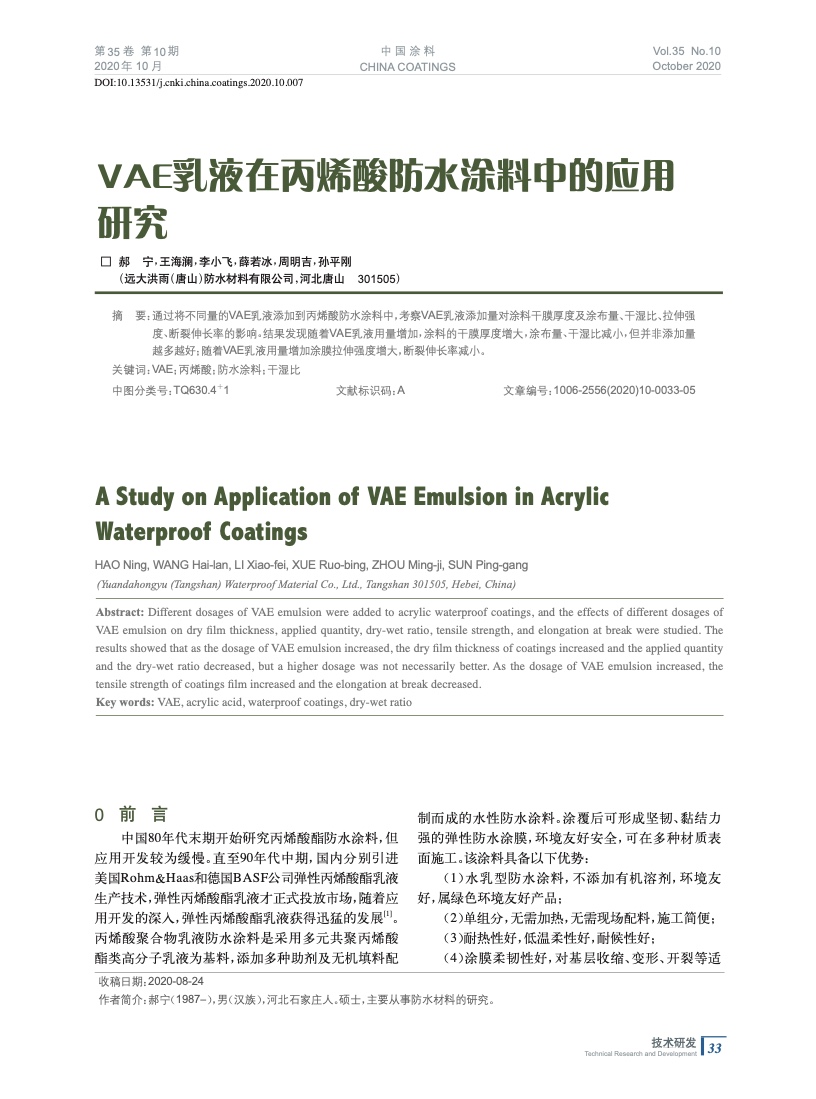 VAE乳液在丙烯酸防水涂料中的應(yīng)用研究
