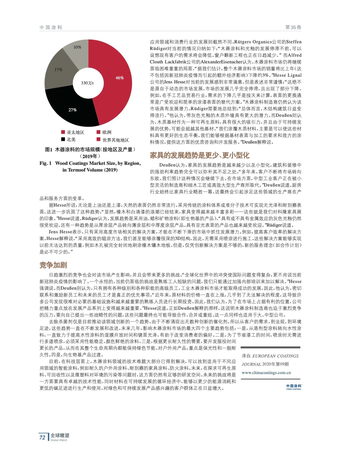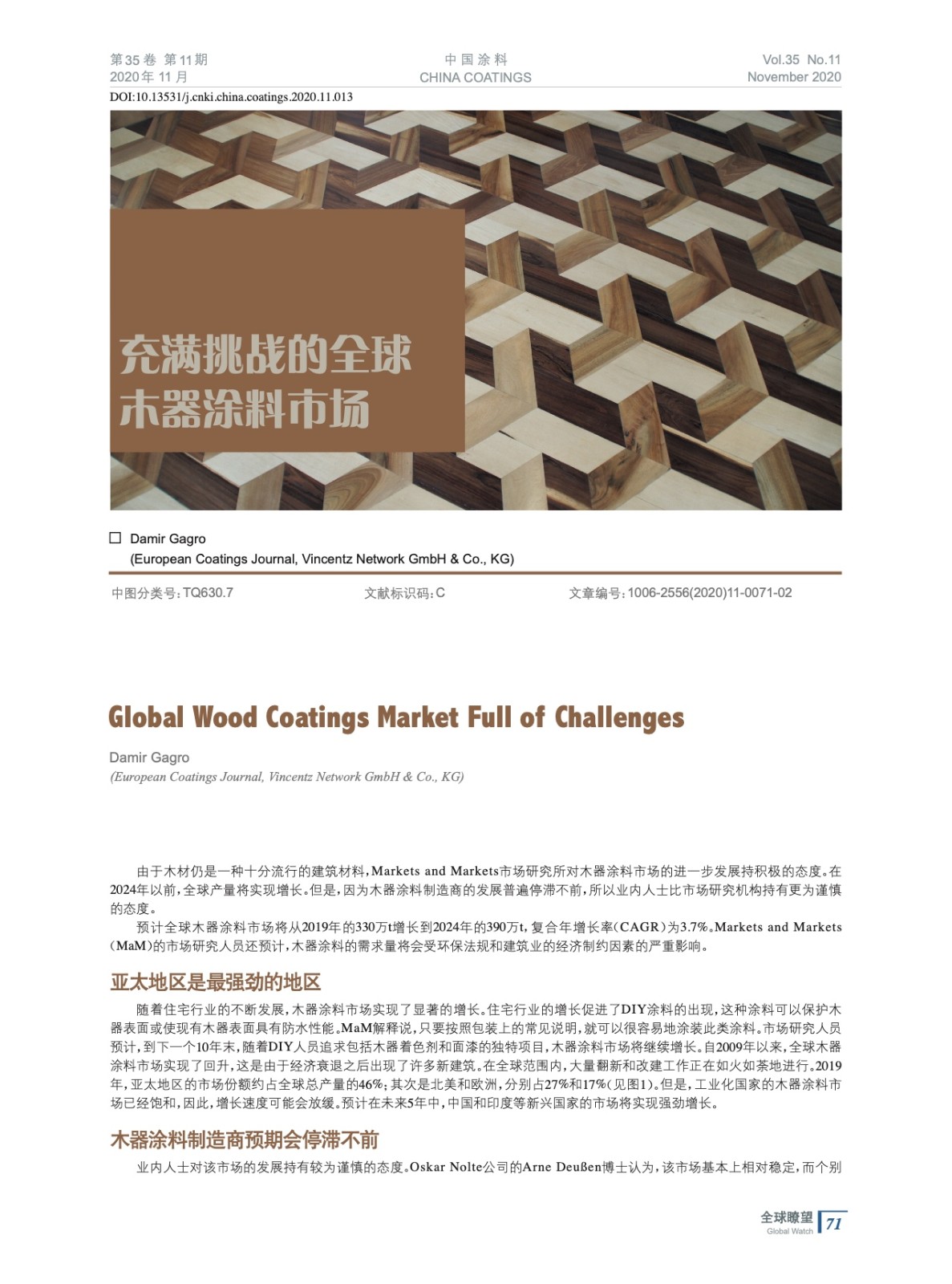編者按:預計全球木器涂料市場將從2019年的330萬t增長到2024年的390萬t,復合年增長率(CAGR)為3.7%。Markets and Markets(MaM)的市場研究人員還預計,木器涂料的需求量將會受環保法規和建筑業的經濟制約因素的嚴重影響。