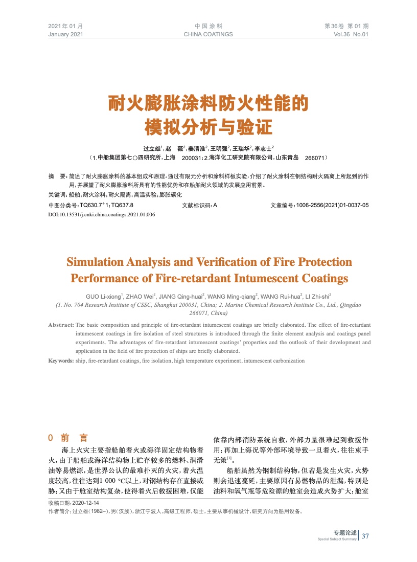 簡述了耐火膨脹涂料的基本組成和原理。通過有限元分析和涂料樣板實驗,介紹了耐火涂料在鋼結構耐火隔離上所起到的作用,并展望了耐火膨脹涂料所具有的性能優勢和在船舶耐火領域的發展應用前景。