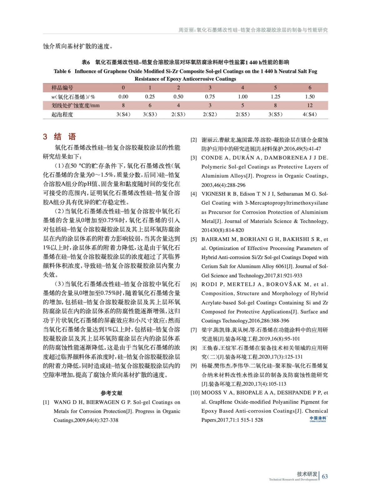 摘要:將氧化石墨烯引入硅–鋯復(fù)合溶膠,制備了氧化石墨烯改性硅–鋯復(fù)合溶膠凝膠涂層并研究了其性能。研究發(fā)現(xiàn):氧化石墨烯改性硅–鋯復(fù)合溶膠A組分具有優(yōu)異的貯存穩(wěn)定性;當(dāng)氧化石墨烯在硅–鋯復(fù)合溶膠中的質(zhì)量分?jǐn)?shù)從0增加至0.75%時,氧化石墨烯對涂層體系的附著力影響較弱,并且提高了涂層體系的防腐蝕性能,當(dāng)其質(zhì)量分?jǐn)?shù)達到1%以上時,隨著氧化石墨烯含量的增加,涂層體系的附著力和防腐蝕性能都逐漸降低。