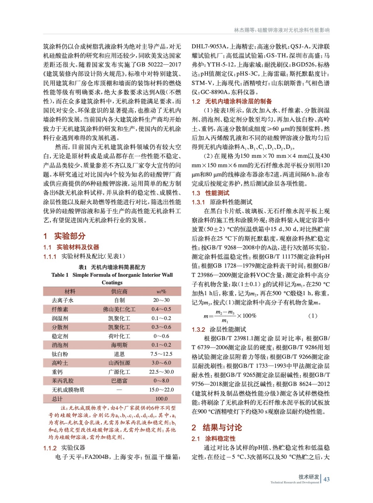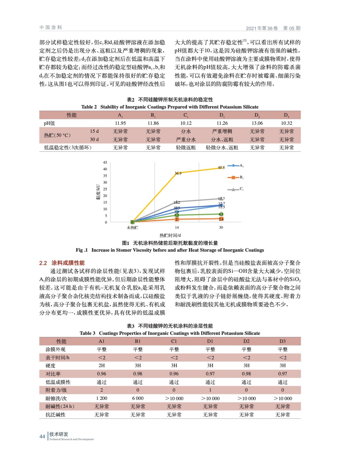 摘要:以無機硅酸鉀溶液為主要成膜物質(zhì)配合少量苯丙乳膠,采用機械共混的方法將水、纖維素、分散潤濕劑、消泡劑、穩(wěn)定劑、鈦白粉、高嶺土、重鈣等在高速攪拌下分散均勻,制成無機內(nèi)墻涂料。在工藝與其他材料相同的條件下,對比不同硅酸鉀溶液制成無機內(nèi)墻涂料的涂膜性能和貯存穩(wěn)定性。結(jié)果表明,試樣在50 ℃下貯存30 d后黏度增幅較小、無異常,且耐洗刷次數(shù)可達到10 000次以上,涂膜性能優(yōu)異。