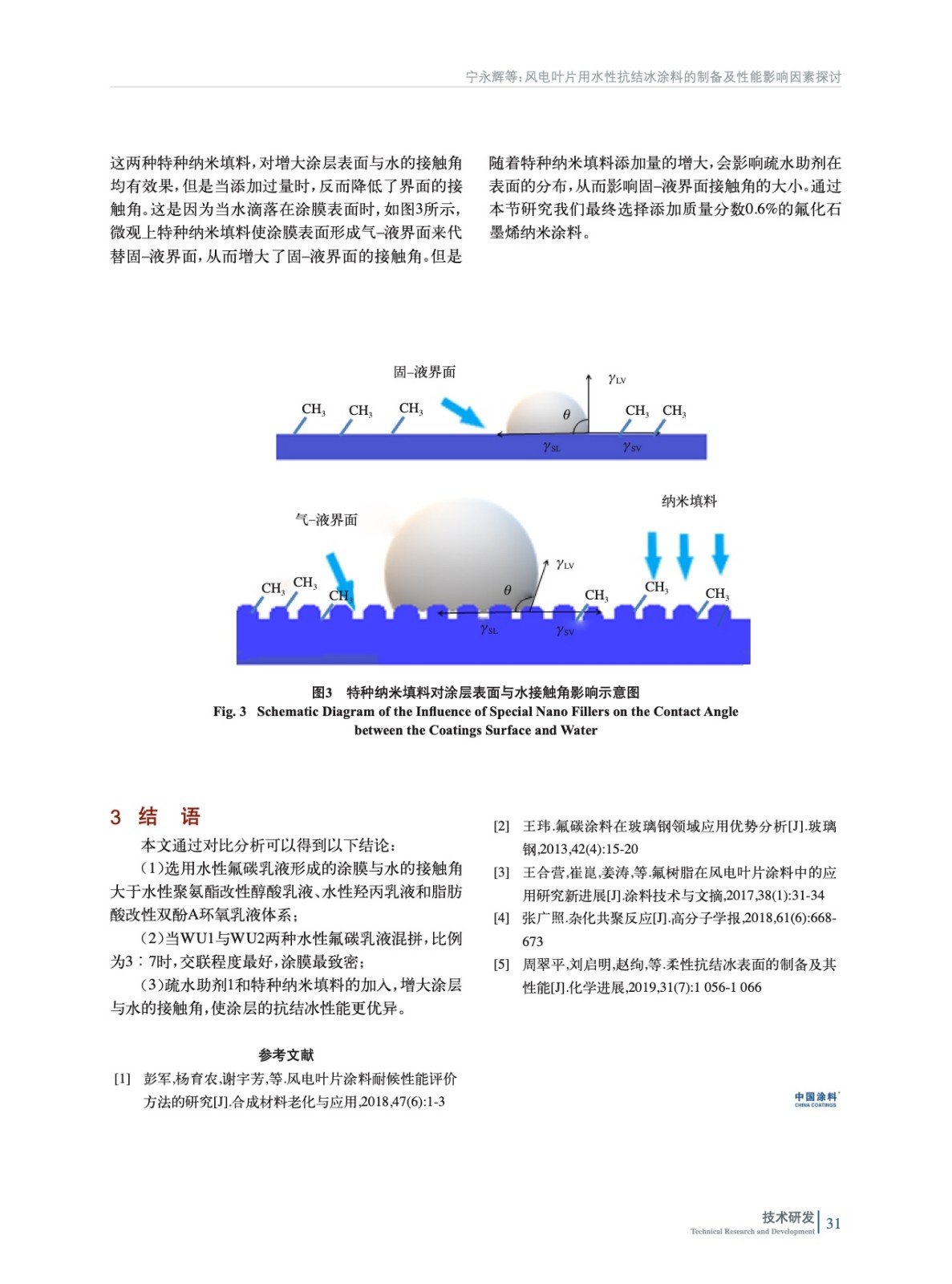 摘要:制備了一種風(fēng)電葉片用水性抗結(jié)冰涂料,考察了成膜物種類及配比、疏水助劑、特種填料對(duì)水性抗結(jié)冰涂料性能的影響。結(jié)果表明:采用氟碳乳液WU1/WU2為主體,以3︰7比例作為成膜物,添加3%(質(zhì)量分?jǐn)?shù),后同)聚二甲基硅氧烷類疏水助劑,并添加0.6%氟化石墨烯,制備的抗結(jié)冰涂料的抗結(jié)冰性能最好。