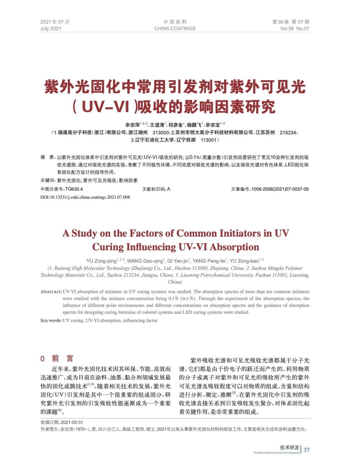 摘要:以紫外光固化體系中引發劑對紫外可見光(UV-VI)吸收的研究,以0.1%(質量分數)引發劑濃度研究了常見10余種引發劑的吸收光譜圖。通過對吸收光譜的實驗,考察了不同極性環境、不同濃度對吸收光譜的影響,以及吸收光譜對有色體系、LED固化體系固化配方設計的指導作用。