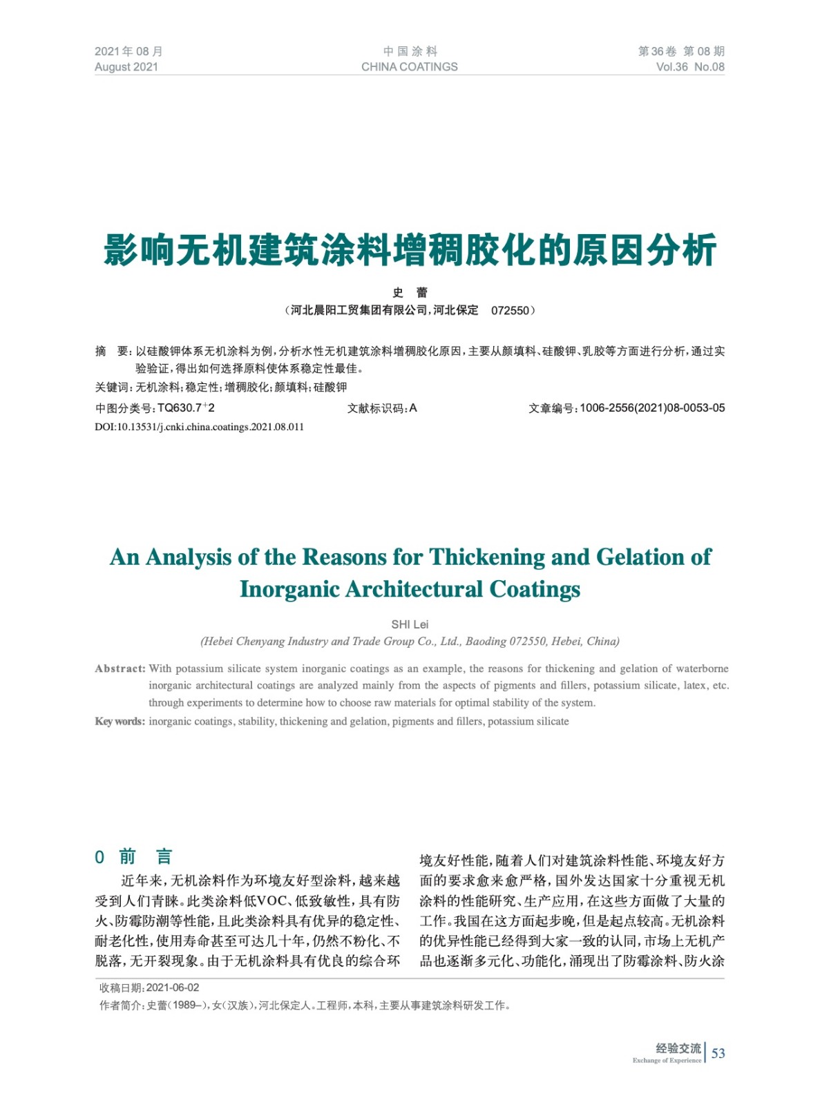 摘要:以硅酸鉀體系無(wú)機(jī)涂料為例,分析水性無(wú)機(jī)建筑涂料增稠膠化原因,主要從顏填料、硅酸鉀、乳膠等方面進(jìn)行分析,通過(guò)實(shí)驗(yàn)驗(yàn)證,得出如何選擇原料使體系穩(wěn)定性最佳。