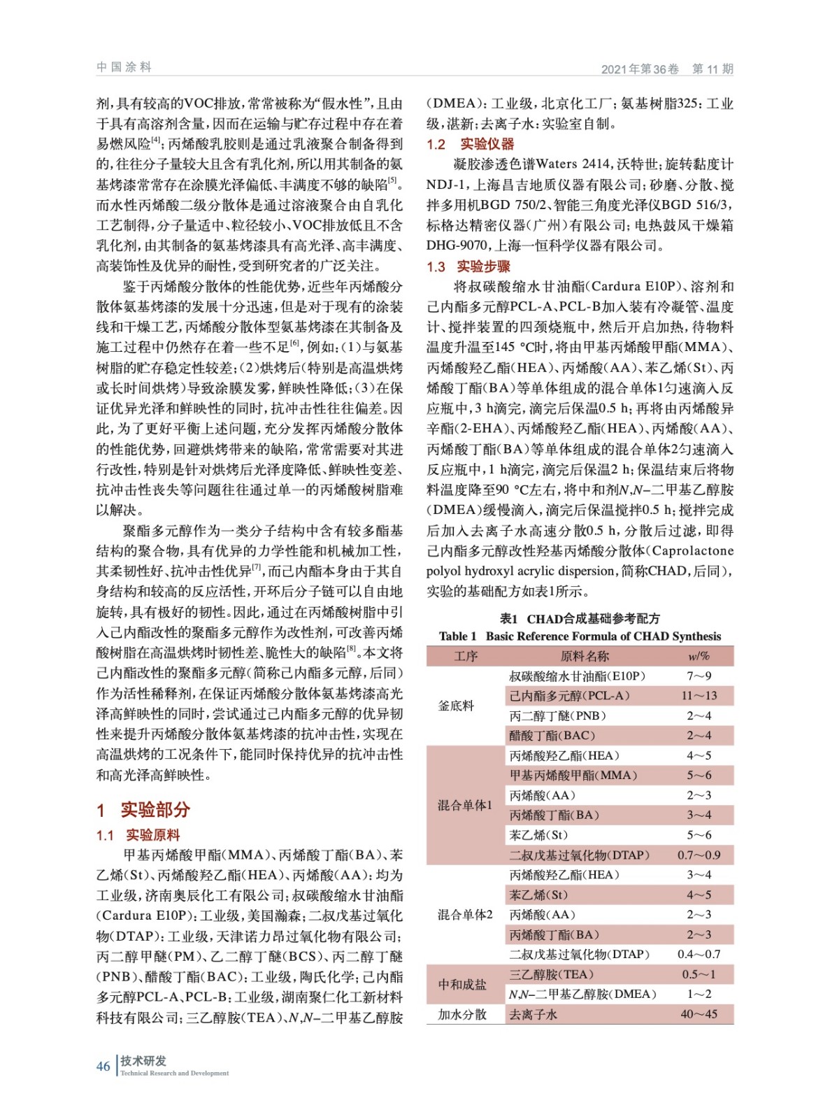 摘要:以己內酯改性聚酯多元醇PCL-A作為活性稀釋劑,制備出了高光澤高抗沖擊性的羥基丙烯酸二級分散體,實驗結果表明:當以丙二醇丁醚和醋酸丁酯組成的混合溶劑作為聚合介質,PCL-A質量分數為12%,分子量約為7800,酸值為11 mgKOH/g時合成的丙烯酸分散體具有優異的光澤和機械性能,其與氨基樹脂配合制成的水性氨基烤漆具有優異的光澤、鮮映性和抗沖擊性,能很好地滿足水性氨基烤漆在高溫烘烤后的性能要求。