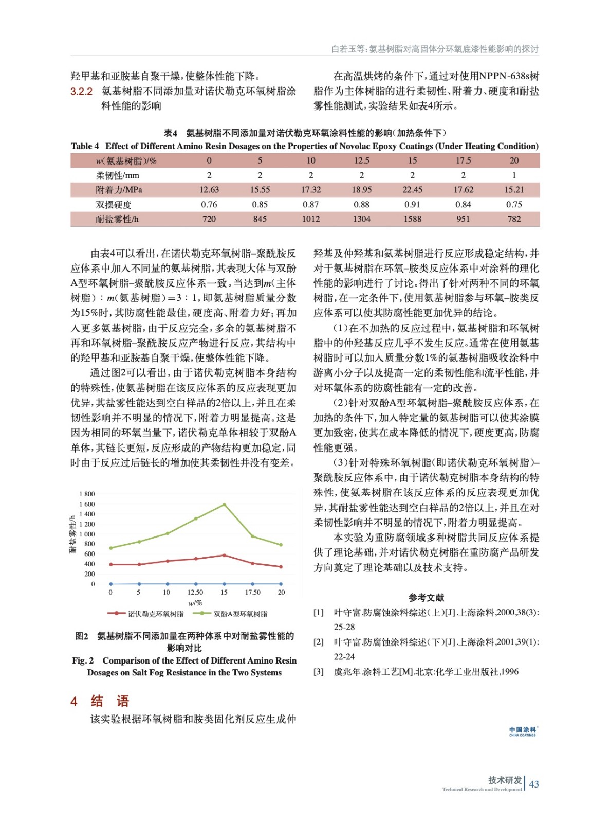 通過高溫烘烤的方式,使氨基樹脂中的羥甲基或烷氧基參與環氧有機胺涂料固化反應,并對于氨基樹脂在環氧–胺類反應體系中對涂料的理化性能的影響進行了討論。結果表明,在一定條件下,使用氨基樹脂參與環氧–胺類反應體系可以使其防腐性能更加優異。