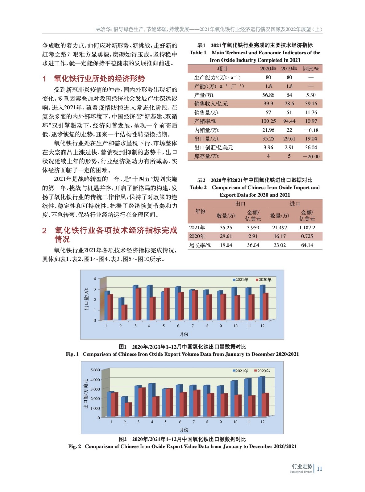 摘要:綜述了2021年中國氧化鐵行業所處的經濟環境,梳理了各項技術經濟指標完成情況、生產營銷情況,并對行業進出口數據進行了分析,從能耗、標準等回顧了氧化鐵行業2021年發展狀況,并展望了2022年發展方向,并指出了行業發展方向。