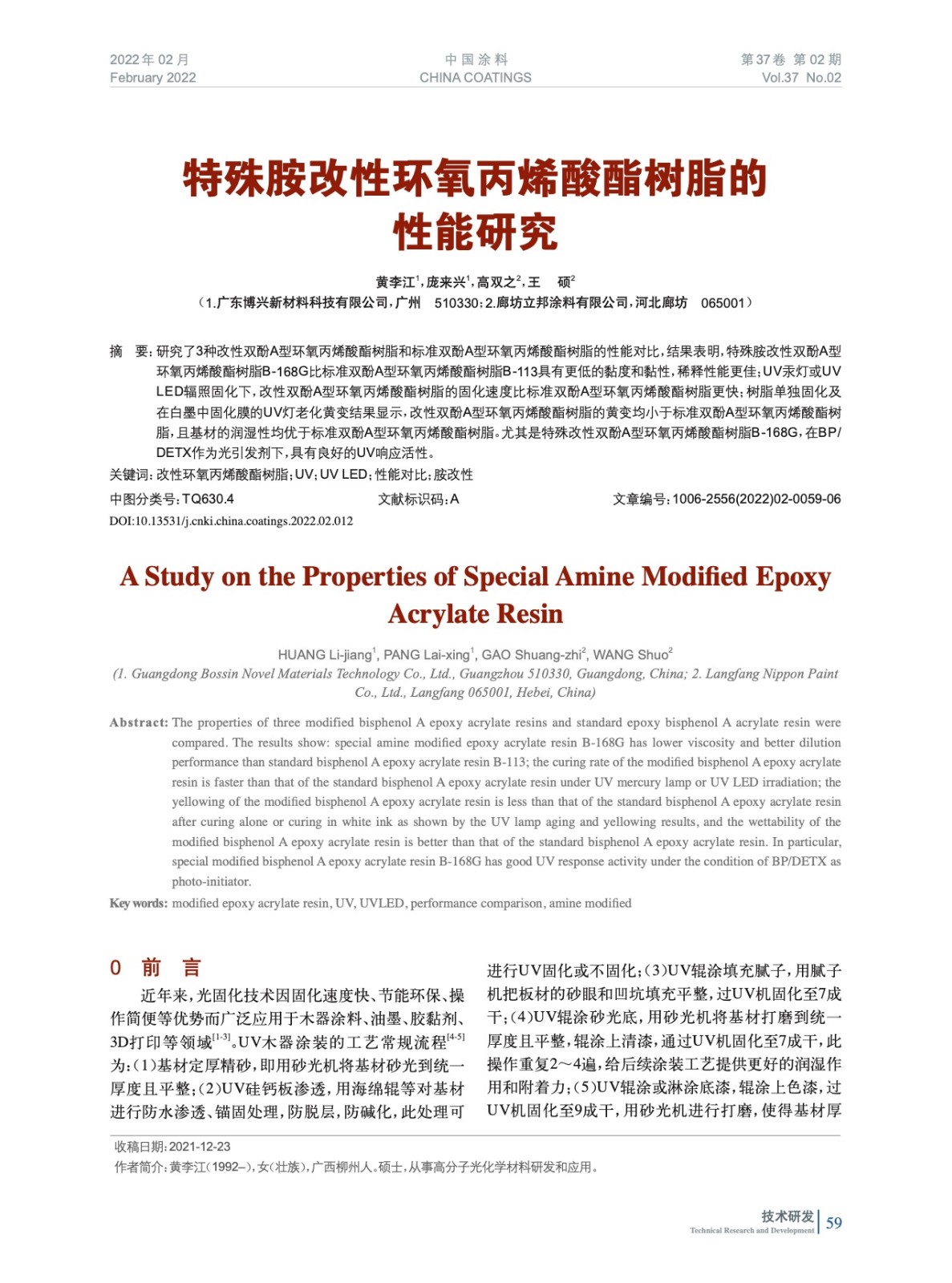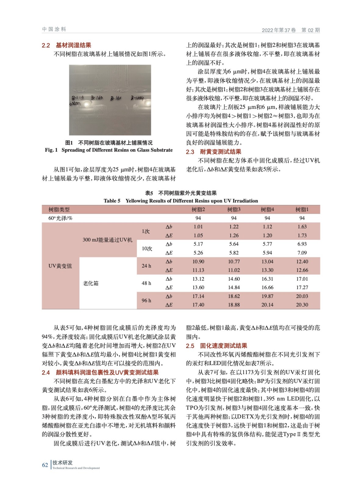 摘要:研究了3種改性雙酚A型環(huán)氧丙烯酸酯樹脂和標(biāo)準(zhǔn)雙酚A型環(huán)氧丙烯酸酯樹脂的性能對比,結(jié)果表明,特殊胺改性雙酚A型環(huán)氧丙烯酸酯樹脂B-168G比標(biāo)準(zhǔn)雙酚A型環(huán)氧丙烯酸酯樹脂B-113具有更低的黏度和黏性,稀釋性能更佳;UV汞燈或UVLED輻照固化下,改性樹脂的固化速度更快;改性樹脂的黃變均較小,且基材的潤濕性均較優(yōu)。在BP/DETX作為光引發(fā)劑下,B-168G具有良好的UV響應(yīng)活性。