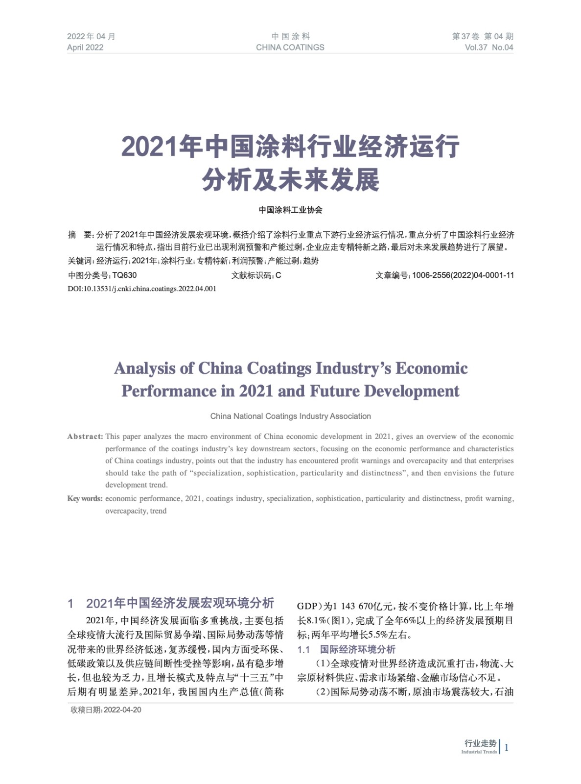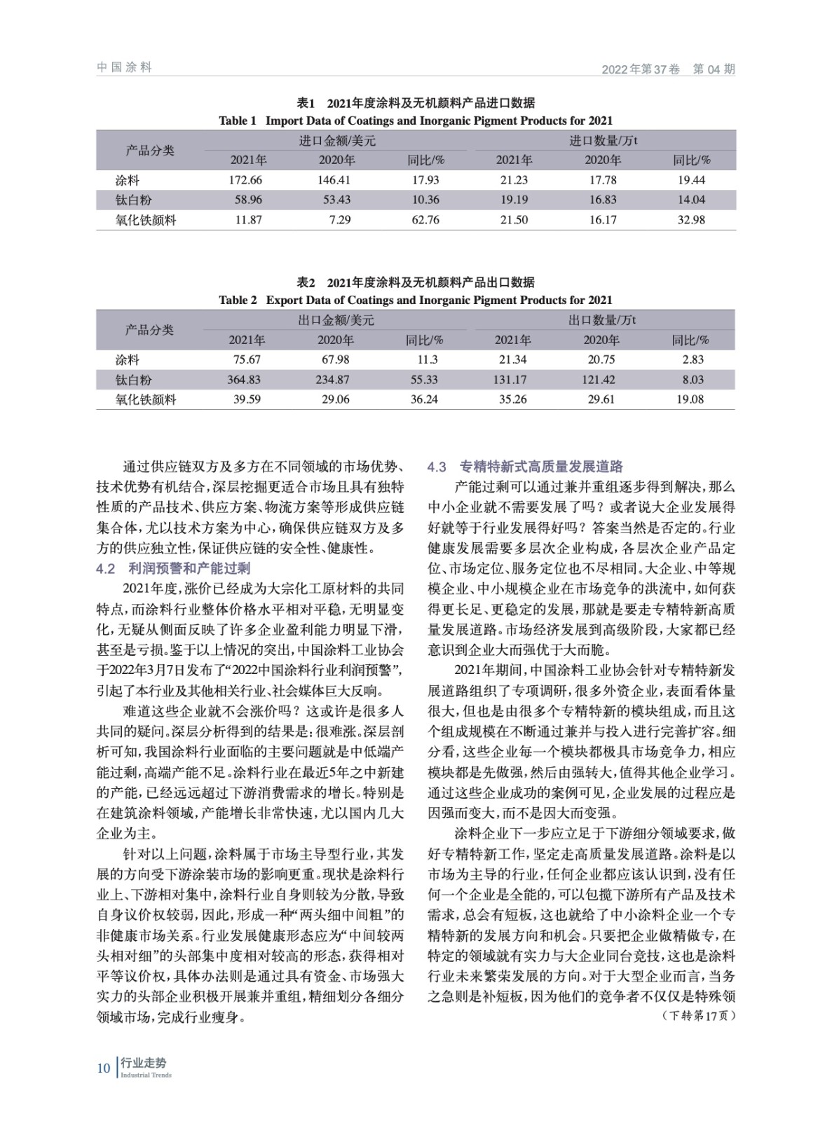 分析了2021年中國經濟發展宏觀環境,概括介紹了涂料行業重點下游行業經濟運行情況,重點分析了中國涂料行業經濟運行情況和特點,指出目前行業已出現利潤預警和產能過剩,企業應走專精特新之路,最后對未來發展趨勢進行了展望。