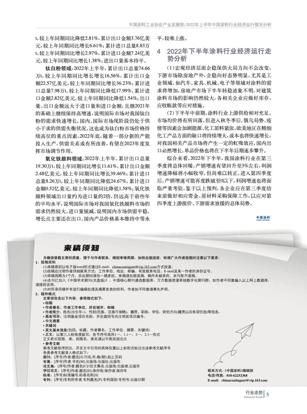 綜述了在受到宏觀經濟下行壓力、上游原材料價格持續高位運行、下游市場不景氣等綜合因素影響下,2022年上半年涂料行業及下游領域發展情況,整理了涂料、顏料行業上半年總體經濟運行數據,并對下半年涂料行業經濟運行走勢進行了預測。