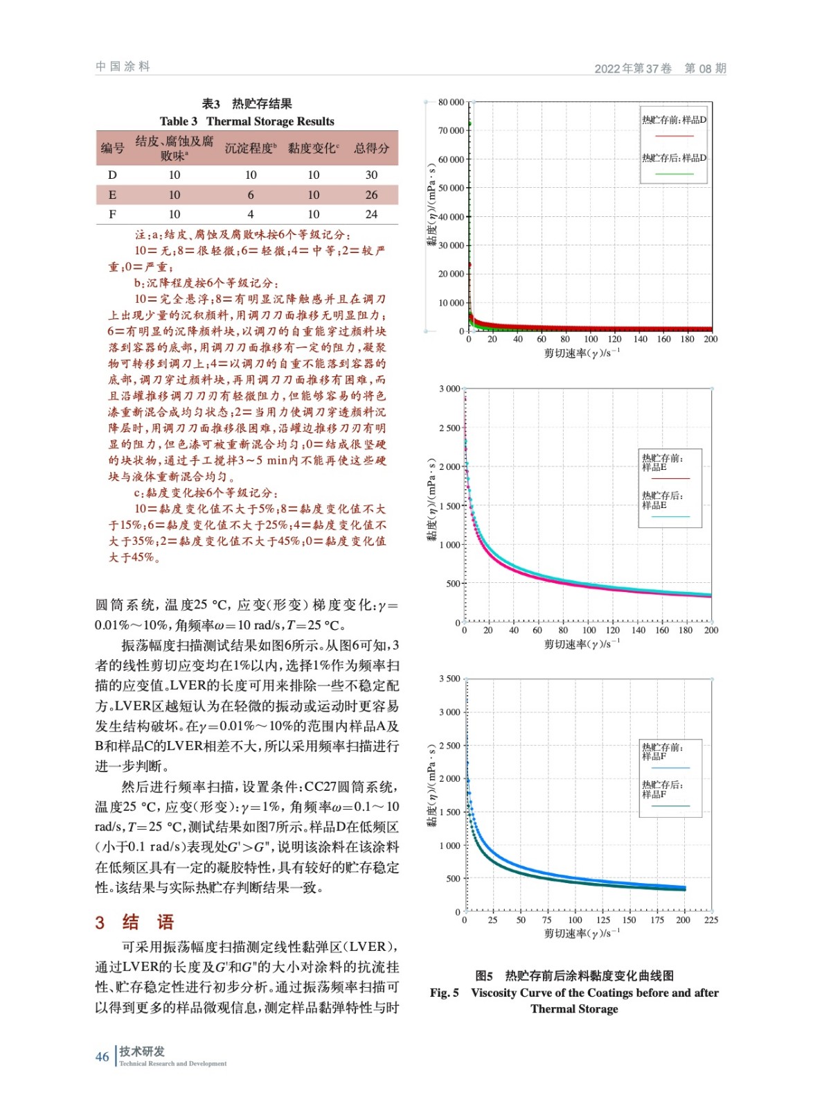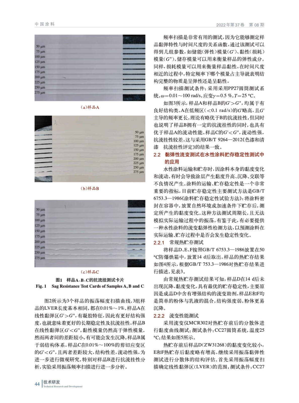 采用振蕩模式下的幅度掃描和頻率掃描對水性涂料的微觀結構進行評估,通過對黏彈性曲線的研究,探討了儲能(彈性)模量(G')、黏性(損耗)模量(G")變化對涂料的貯存穩定性、抗流掛性的影響。