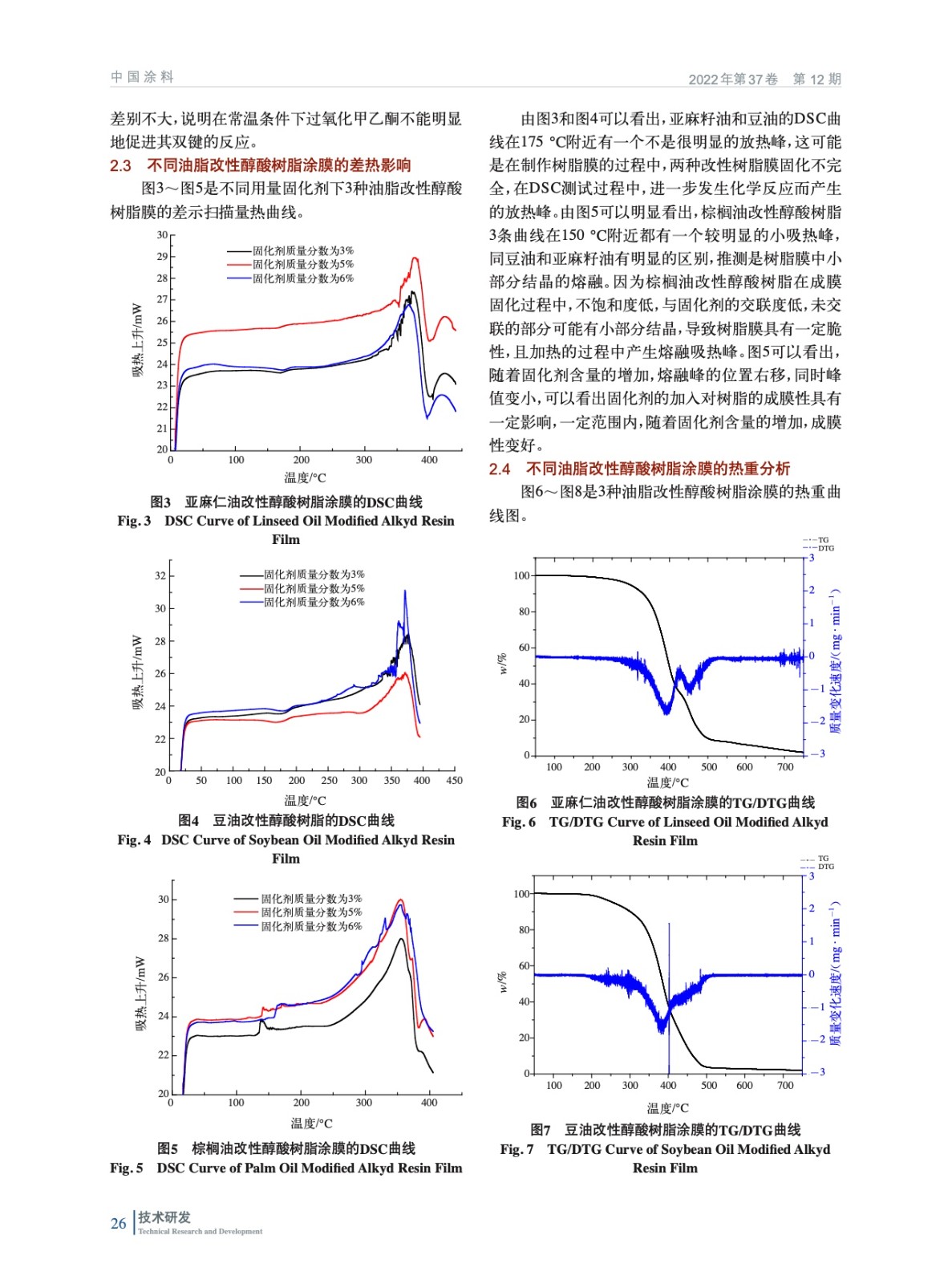 摘要:研究了基于亞麻籽油、豆油、棕櫚油相同油度(約52%~55%)植物油改性醇酸樹脂的成膜性能。利用過氧化甲乙酮(MEKP)作為固化劑,對醇酸樹脂涂膜在空氣中的時間、硬度、附著力、光澤度、沖擊強度、耐化學(xué)性和熱性能與未加固化劑的醇酸樹脂涂膜進(jìn)行了研究和比較。結(jié)果表明,過氧化甲乙酮對亞麻籽油和豆油改性的醇酸樹脂成膜性有一定的改善。通過熱重分析探測到亞麻籽油改性醇酸樹脂涂膜的分解溫度比較高,分解速度慢,耐熱性能更好。在差熱分析(DSC)的測試中發(fā)現(xiàn)棕櫚油改性醇酸樹脂涂膜的成膜的交聯(lián)度低,并且有小部分結(jié)晶,產(chǎn)生了熔融吸熱峰,驗證了棕櫚油改性醇酸樹脂的脆性。