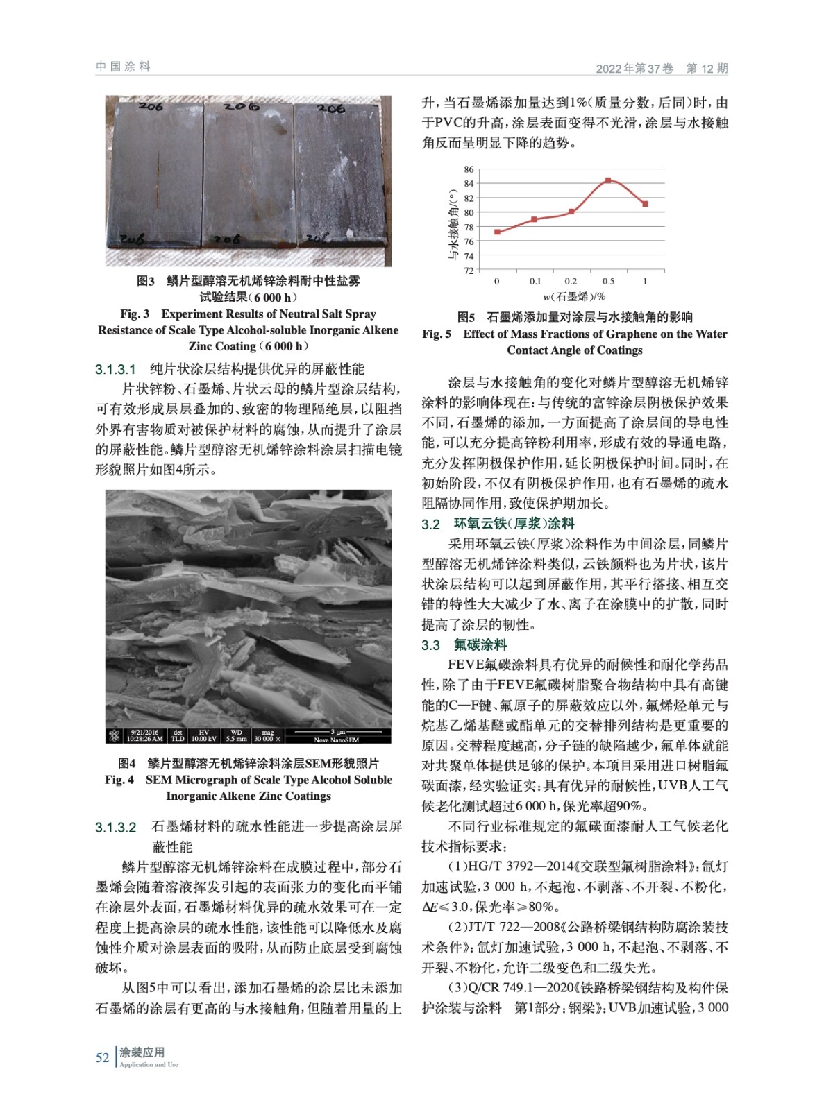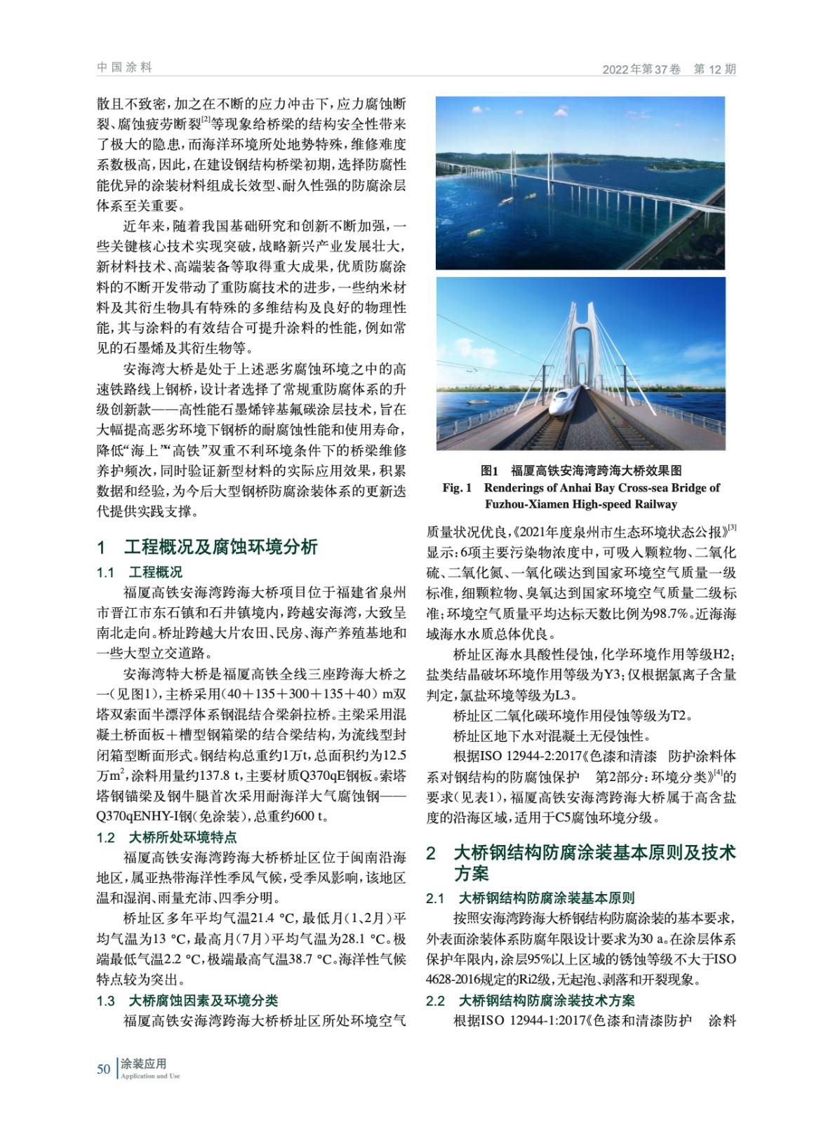 摘要:通過對福廈高鐵安海灣跨海大橋的腐蝕環境和腐蝕因素分析,結合大橋涂裝防腐壽命要求,設計了高性能石墨烯鋅基氟碳涂層技術。采用鱗片型醇溶無機烯鋅涂料作底涂層,環氧云鐵(厚漿)涂料作為中間涂層,進口樹脂氟碳面漆作為面涂層;通過耐鹽霧、與水接觸角、附著力、人工氣候老化等測試方法對涂層性能進行了評價,對福廈高鐵安海灣跨海大橋表面防腐涂層體系進行了研究;通過涂裝前表面處理、防腐涂裝體系要求和涂料產品技術要求等方面,嚴格控制大橋涂裝質量,使配套體系滿足福廈高鐵安海灣跨海大橋使用壽命要求。