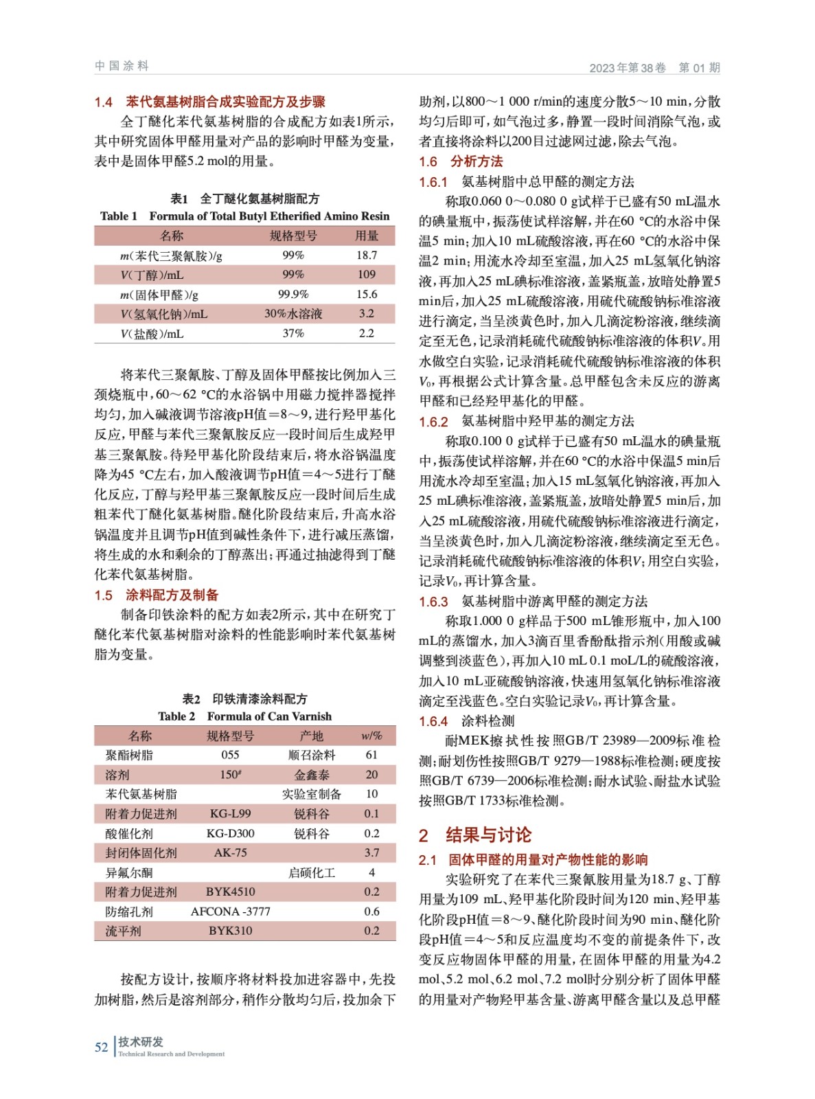 摘要:以固體甲醛、苯代三聚氰胺、丁醇為原料,采用一步兩段法制備出全丁醚化苯代氨基樹脂,研究了固體甲醛的用量及羥甲基化階段的時間對全丁醚化苯代氨基樹脂的影響;同時研究了不同用量的丁醚化苯代氨基樹脂對印鐵涂料的性能影響。研究結(jié)果表明:當(dāng)固體甲醛用量為5.2 mol、羥甲基化時間為120 min、羥甲基化溫度為60 ℃時羥甲基化較為徹底,此時的產(chǎn)品較好;丁醚化苯代氨基樹脂在印鐵涂料中可明顯提高涂料的耐水、耐溶劑、耐鹽、光澤度等性能,證明氨基樹脂具有固化交聯(lián)的作用。