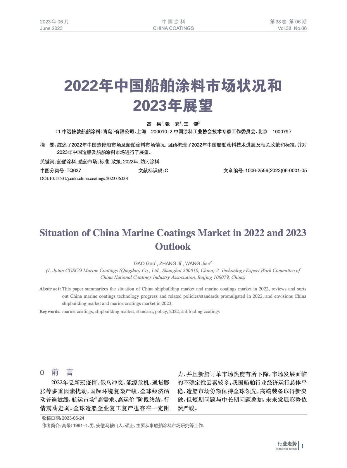 綜述了2022年中國造修船市場及船舶涂料市場情況,回顧梳理了2022年中國船舶涂料技術進展及相關政策和標準,并對2023年中國造船及船舶涂料市場進行了展望。