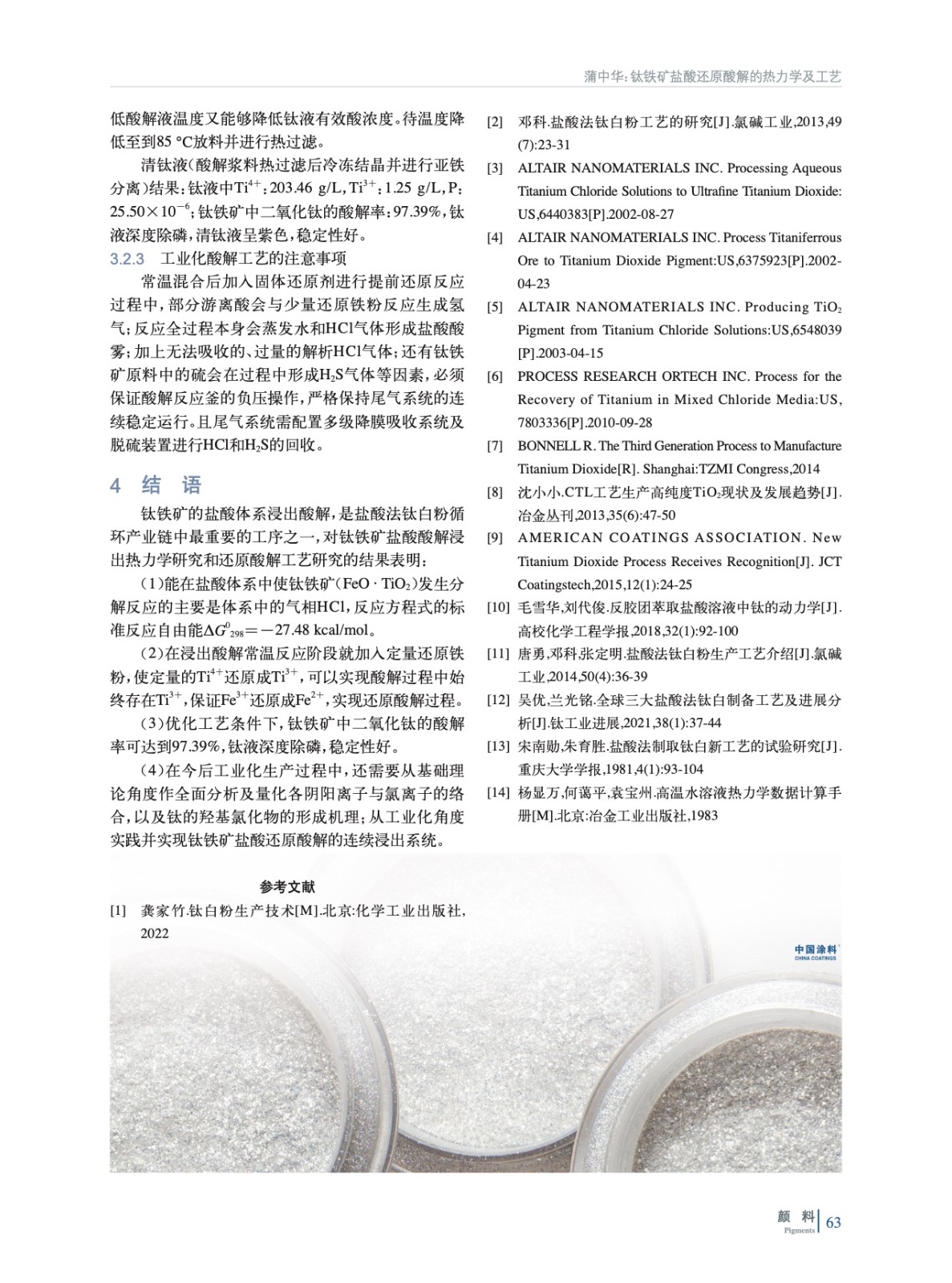 摘要:為強(qiáng)化鹽酸法鈦白粉循環(huán)產(chǎn)業(yè)鏈的酸浸工藝,計(jì)算了鹽酸體系鈦鐵礦分解反應(yīng)的標(biāo)準(zhǔn)反應(yīng)自由能。熱力學(xué)計(jì)算表明能使鈦鐵礦(FeO·TiO2)酸解的浸取劑主要是體系中的氣相HCl,反應(yīng)方程式的ΔG0298為-27.48 kcal/mol。同時(shí)研究了在浸出酸解常溫反應(yīng)階段就加入定量鐵粉,使定量的Ti4+還原成Ti3+,以實(shí)現(xiàn)酸解過(guò)程中始終存在Ti3+,保證Fe3+還原成Fe2+,實(shí)現(xiàn)還原酸解過(guò)程。優(yōu)化工藝條件下,鈦鐵礦酸解率為97.39%,鈦液深度除磷及穩(wěn)定性好。