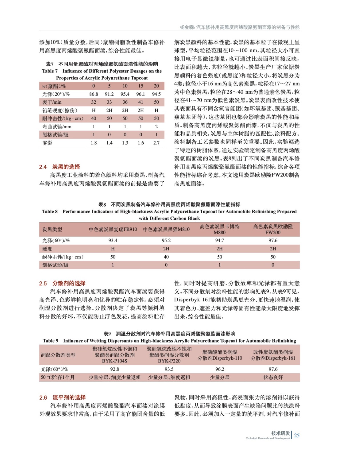 汽車修補用高黑度丙烯酸聚氨酯面漆的制備與性能