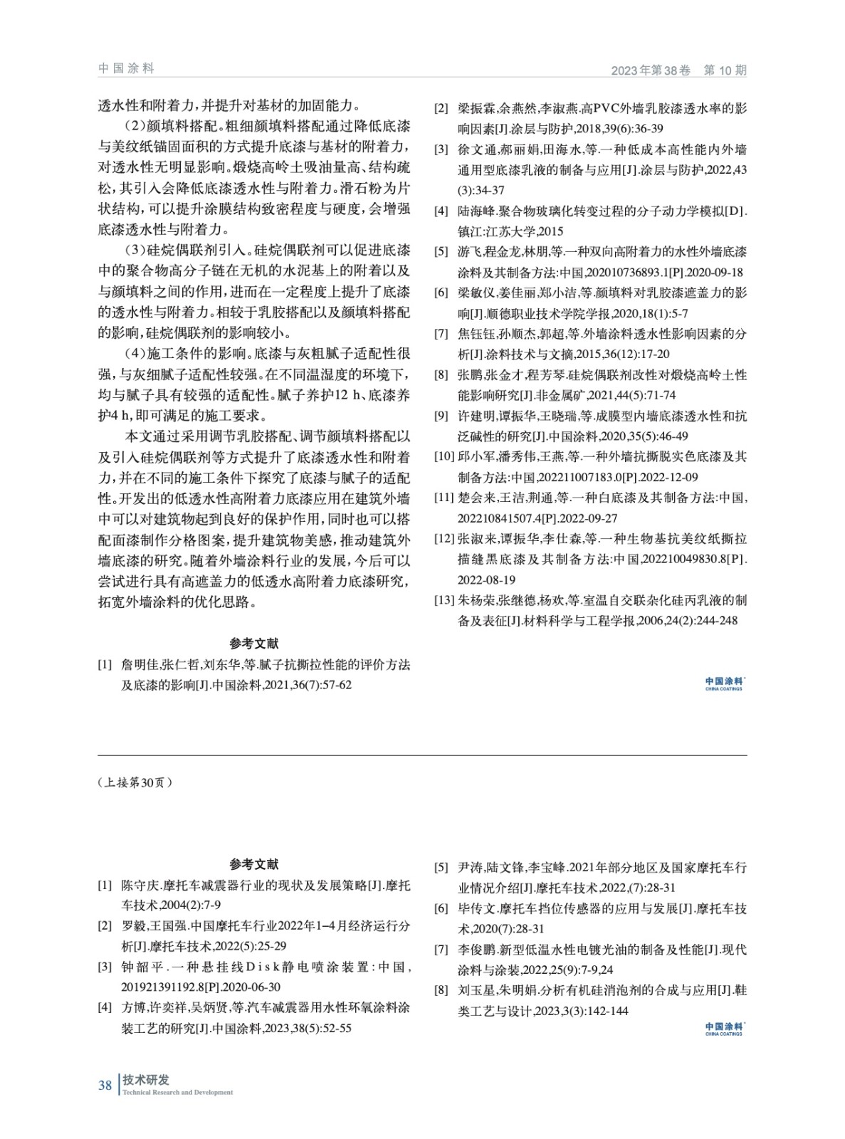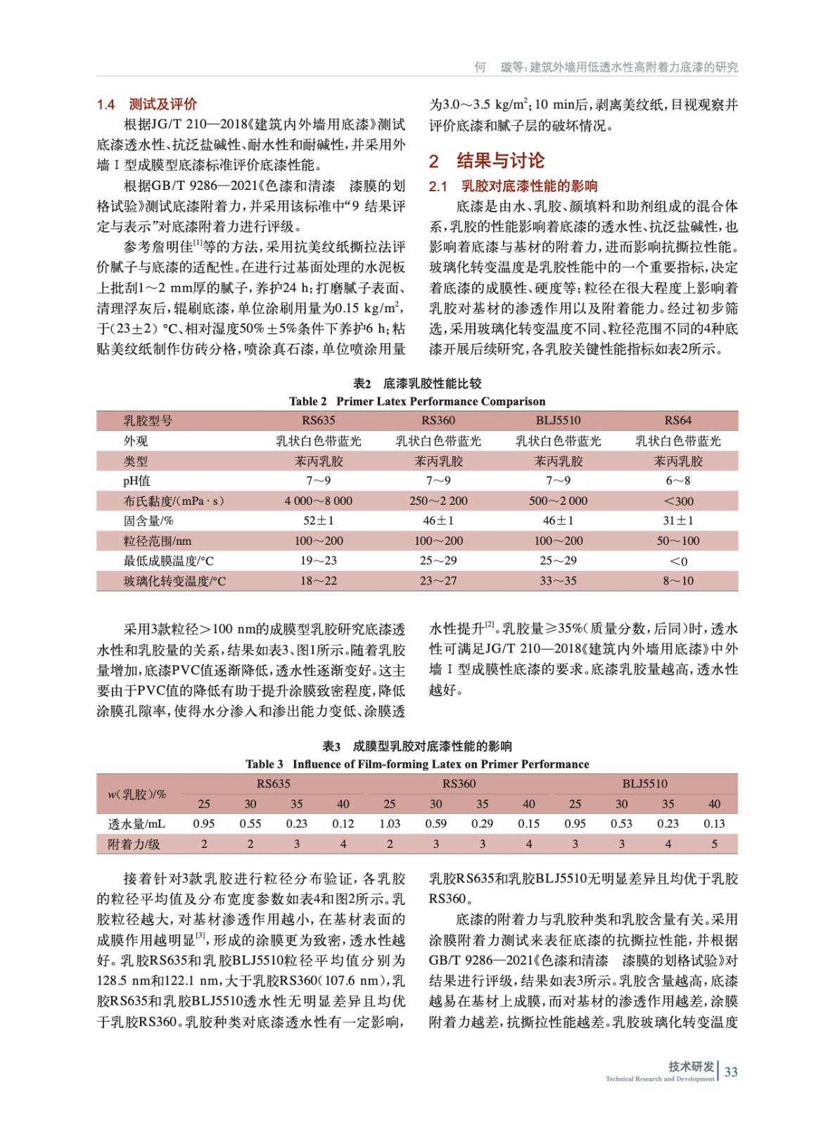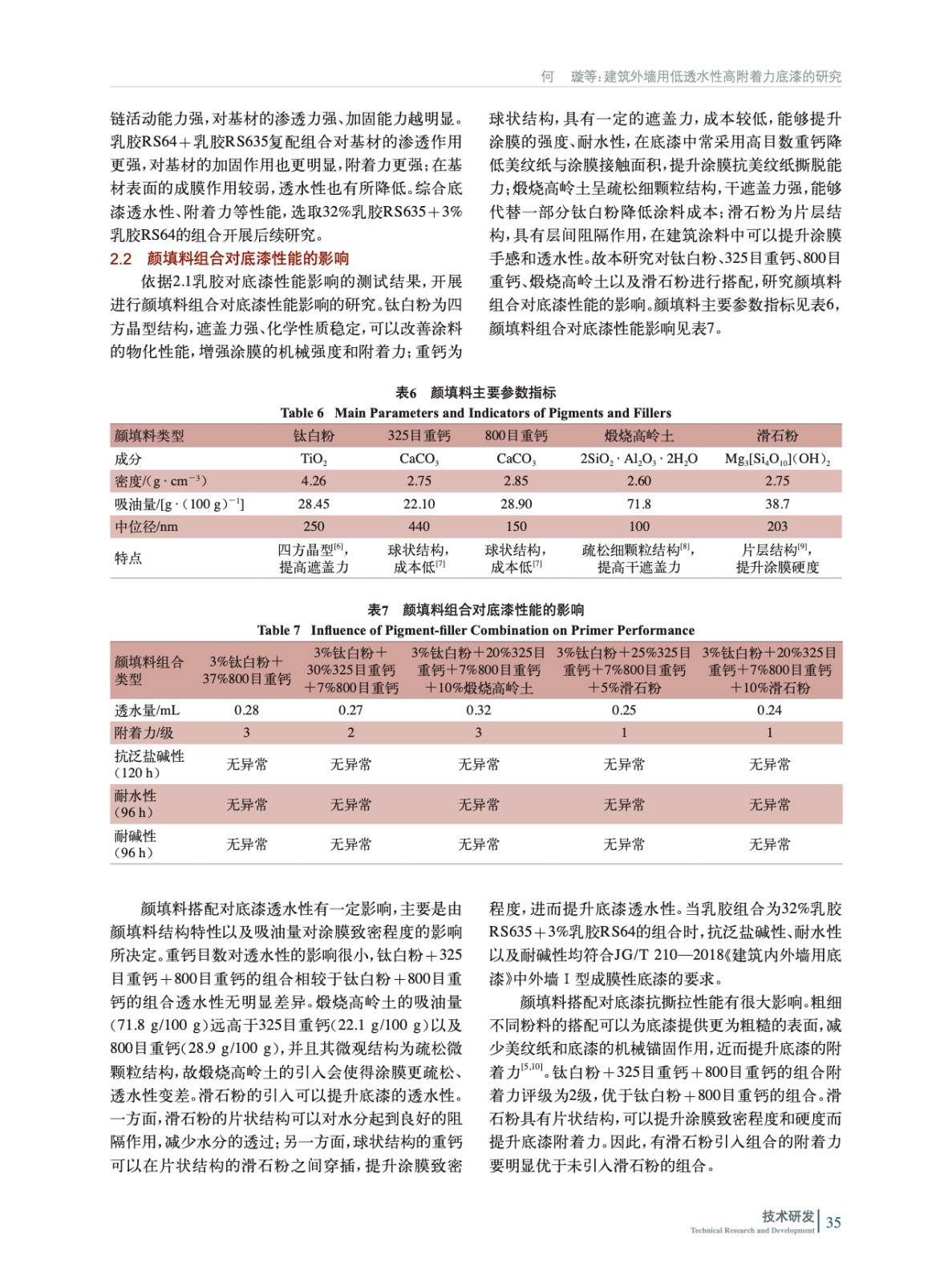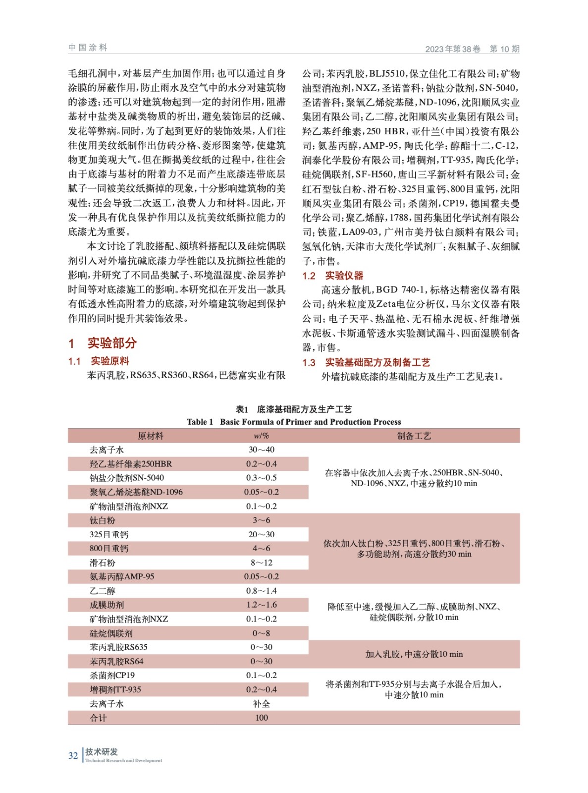 摘要:研究了乳膠搭配、顏填料搭配以及硅烷偶聯(lián)劑引入對底漆性能的影響,開發(fā)出低透水性高附著力外墻用底漆。結(jié)果表明:采用粒徑小、玻璃化轉(zhuǎn)變溫度低的乳膠復(fù)配粒徑大、玻璃化轉(zhuǎn)變溫度高的乳膠可以平衡底漆透水性和附著力,并提升其對基材的加固性能。采用粗細顏填料搭配可以降低底漆與美紋紙錨固面積,減弱美紋紙撕脫底漆風險;滑石粉的引入可以提升涂膜致密程度與硬度,提升底漆透水性與附著力。開發(fā)出的低透水性高附著力外墻用底漆在不同溫濕度環(huán)境下,均與灰粗膩子具有較強的適配性。
