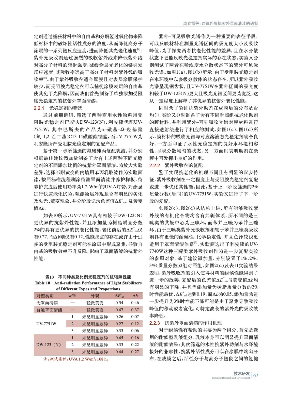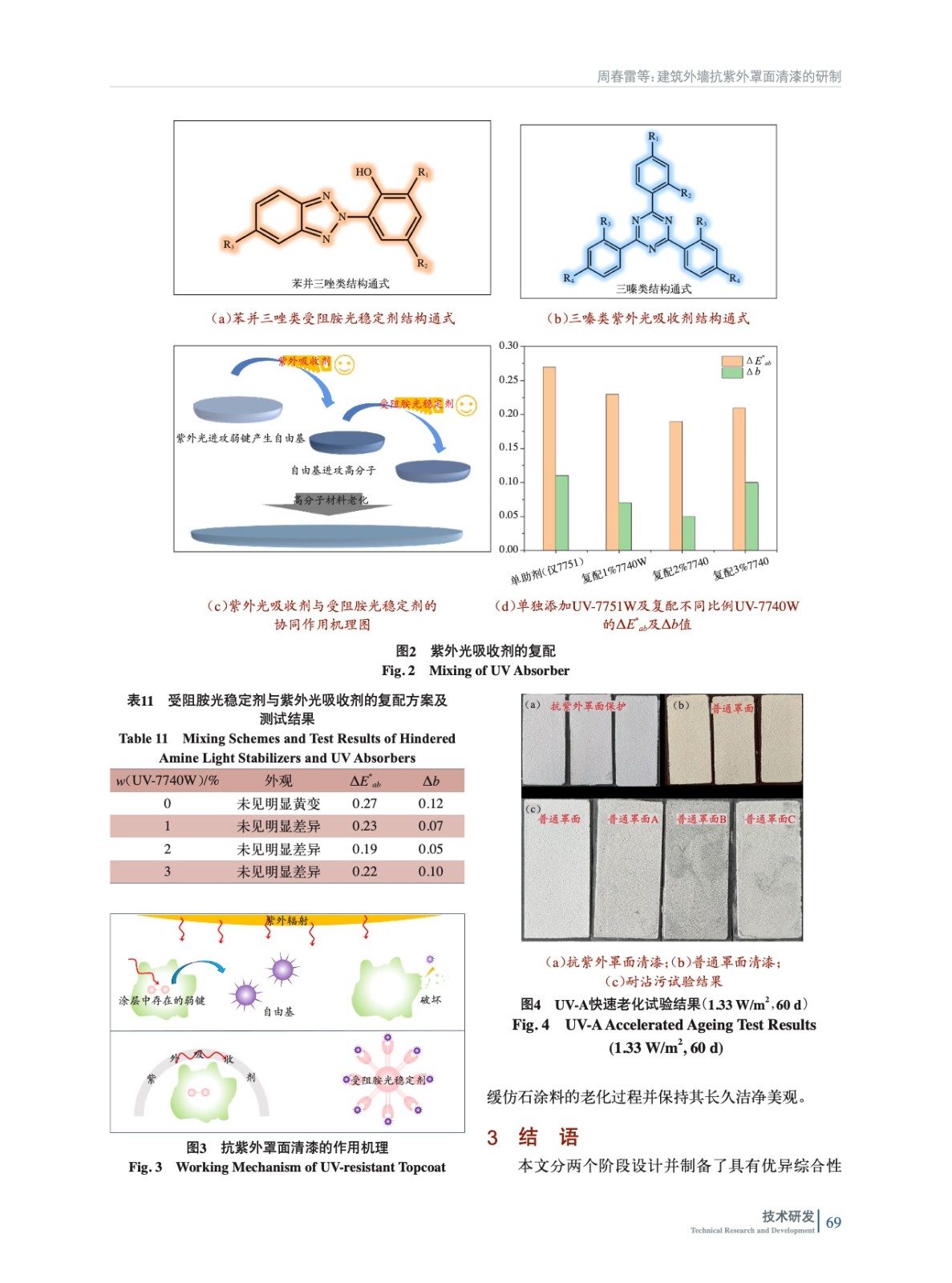 摘要:開發(fā)一款具有耐老化性能的罩面清漆,不僅可以起到屏蔽紫外線的功效,而且方便施工,具有極佳的便捷性與適用性。實驗結(jié)果表明,實驗開發(fā)的罩面清漆具有優(yōu)異的耐老化性能,涂層整體抗老化性能的明顯提升,紫外吸收光譜表明,UV-7751W相較于DW-123(N)在紫外波段有更寬泛的響應區(qū)間,表現(xiàn)出更良好的抗紫外老化性能,且復配紫外光吸收劑性能更優(yōu),其他基礎涂膜性能如耐沾污性(<10%)和耐洗刷性(>10 000次)遠超標準,這對于長久地保持建筑物清潔自然,延長建筑物的翻新周期,節(jié)約自然資源至關(guān)重要,符合新時代的發(fā)展要求。