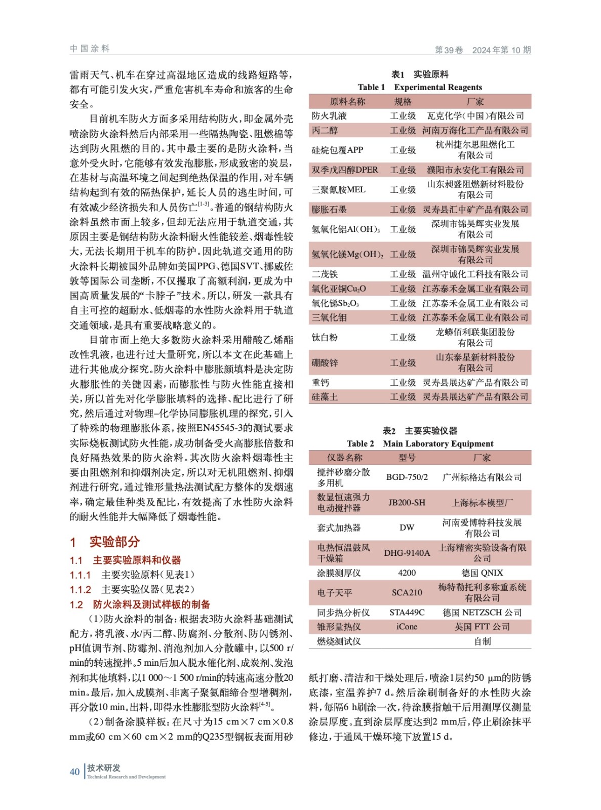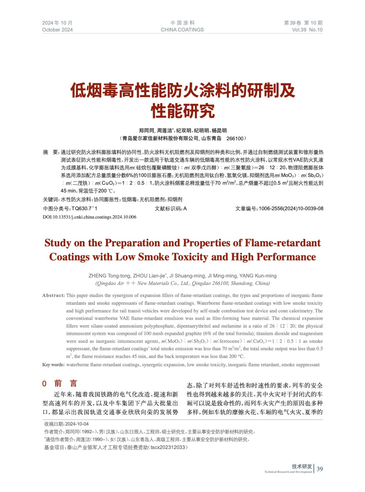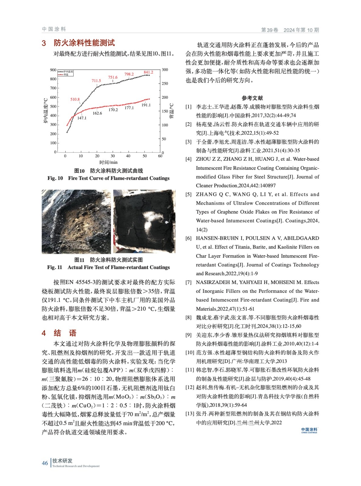 摘要:通過研究防火涂料膨脹填料的協同性、防火涂料無機阻燃劑及抑煙劑的種類和比例,并通過自制燃燒測試裝置和錐形量熱測試表征防火性能和煙毒性,開發出一款適用于軌道交通車輛的低煙毒高性能的水性防火涂料。以常規水性VAE防火乳液為成膜基料,化學膨脹填料選用m(硅烷包覆聚磷酸銨)∶m(雙季戊四醇)︰m(三聚氰胺)=26︰12︰20,物理阻燃膨脹體系選用添加配方總量質量分數6%的100目膨脹石墨;無機阻燃劑選用鈦白粉、氫氧化鎂,抑煙劑選用m(MoO3)︰m(Sb2O3)︰m(二茂鐵)︰m(CuO2)=1︰2︰0.5︰1,防火涂料煙霧總釋放量低于70 m2/m2,總產煙量不超過0.5 m2且耐火性能達到45 min,背溫低于200 ℃。