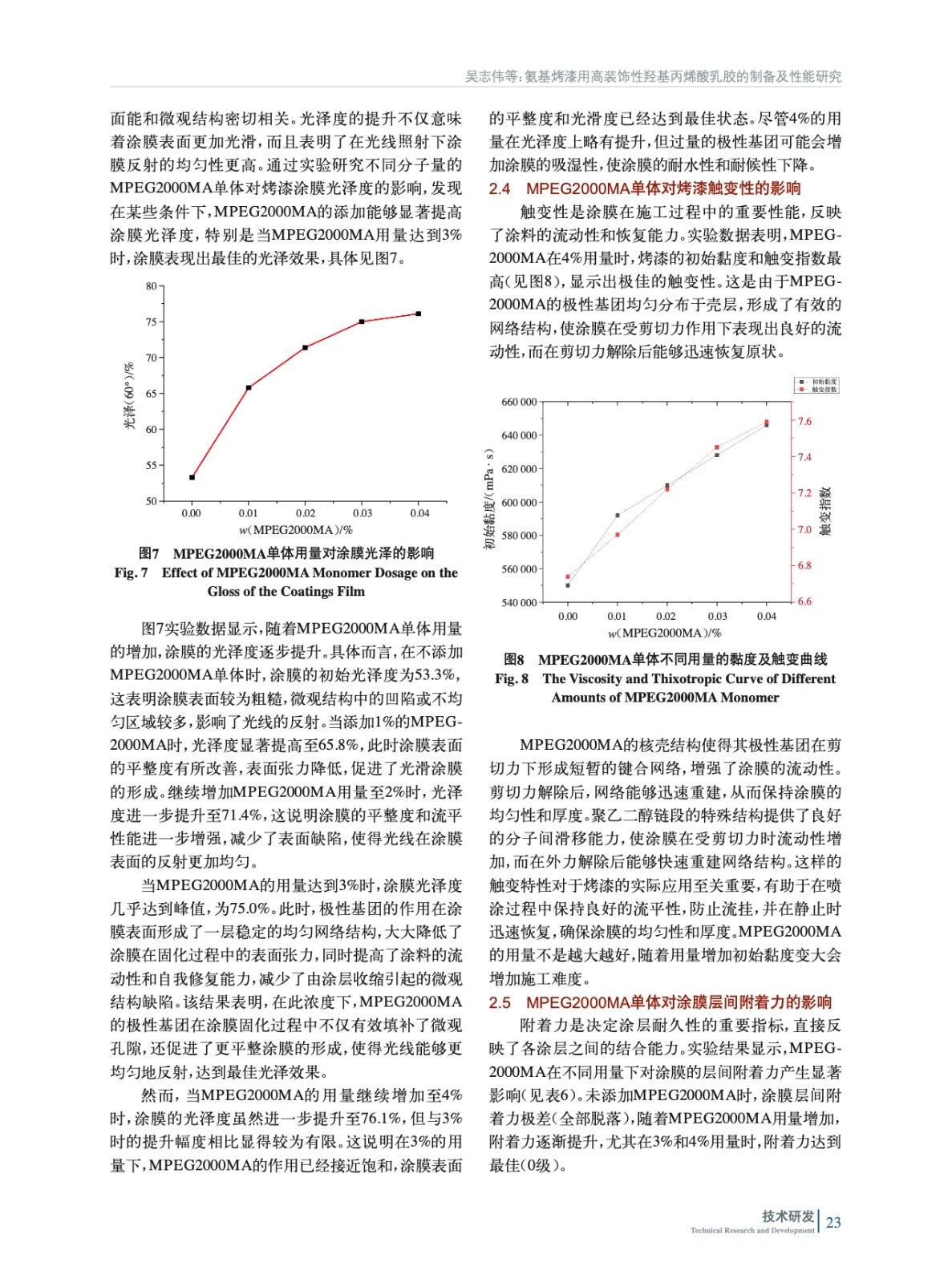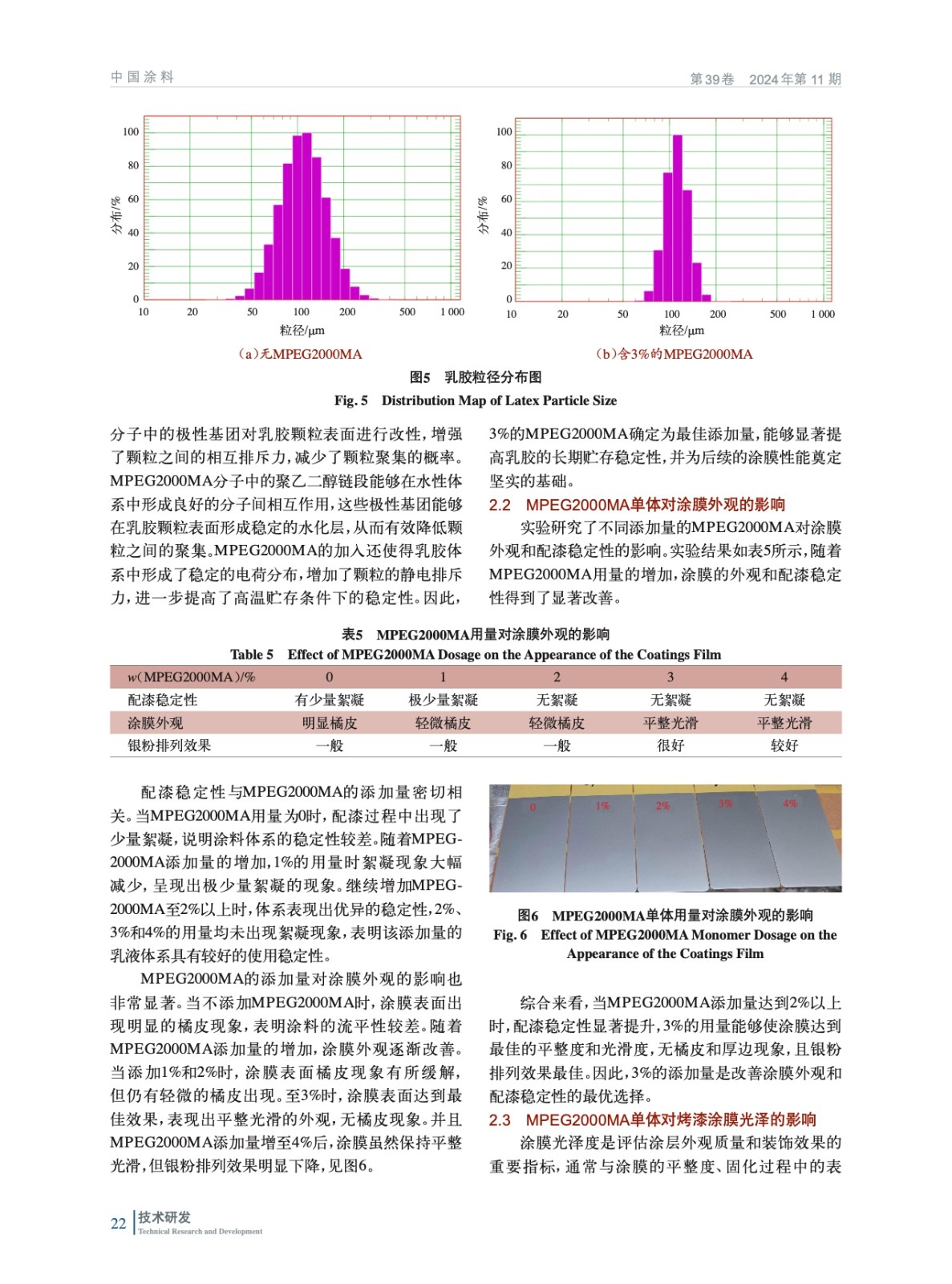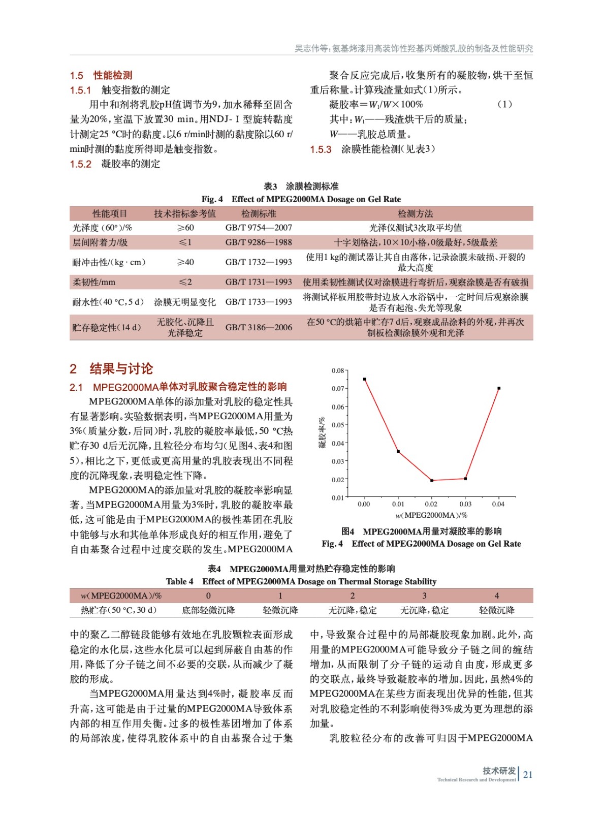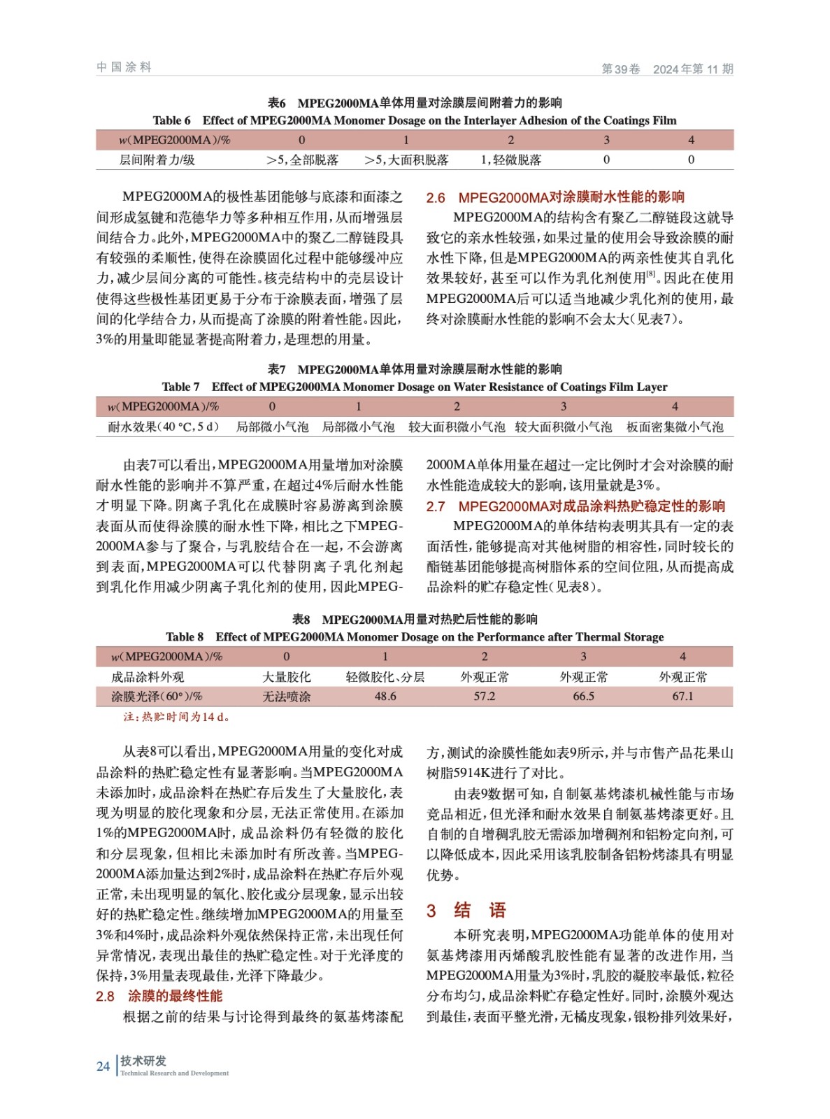 摘要:以甲基丙烯酸甲酯(MMA)、丙烯酸丁酯(BA)、甲基丙烯酸(MAA)、甲基丙烯酸羥乙酯(HEMA)為單體,甲氧基聚乙二醇甲基丙烯酸酯(MPEG2000MA)為功能單體,制備出了氨基烤漆用高裝飾性的核殼型羥基丙烯酸乳膠。實驗結果表明,MPEG2000MA功能單體能夠很好地提高氨基烤漆涂膜的銀粉排列效果、光澤以及具有良好的層間附著力,且當功能單體MPEG2000MA質量分數在3%,并分布在乳膠殼外層時,所制備的氨基烤漆流平性好,觸變指數高,銀排效果好,重涂層間附著力強。