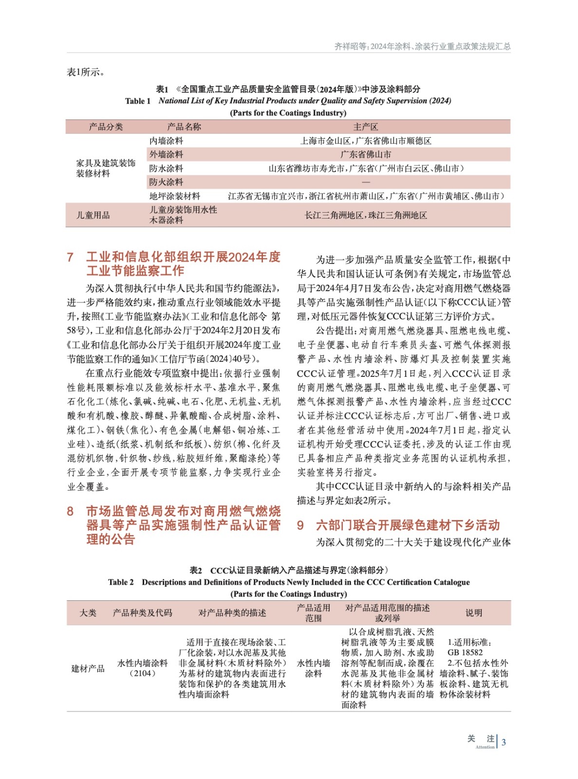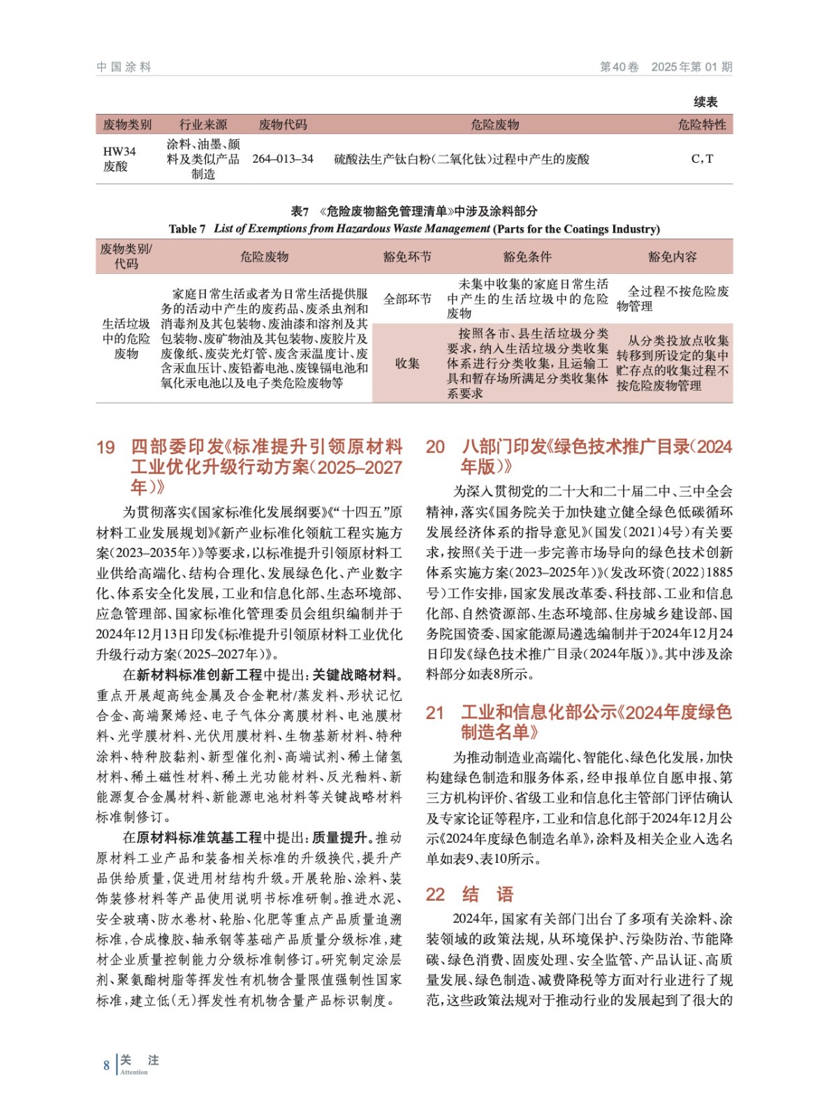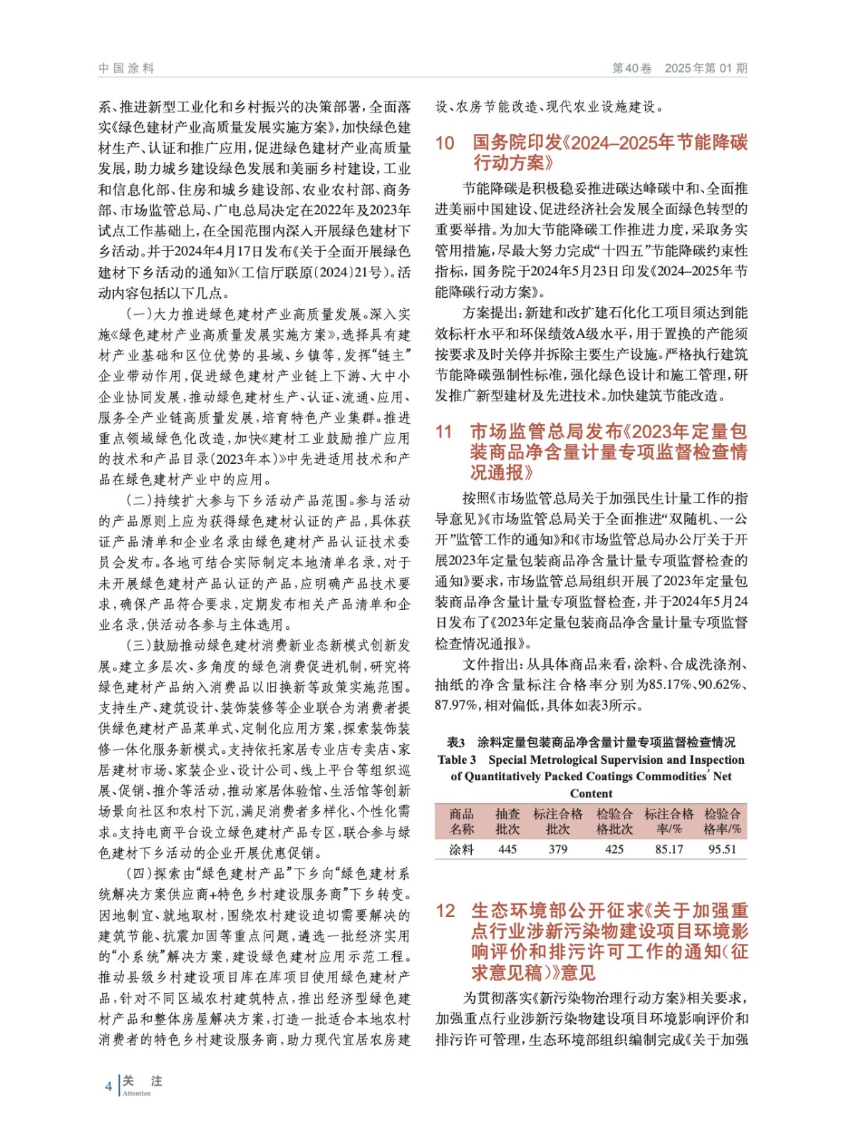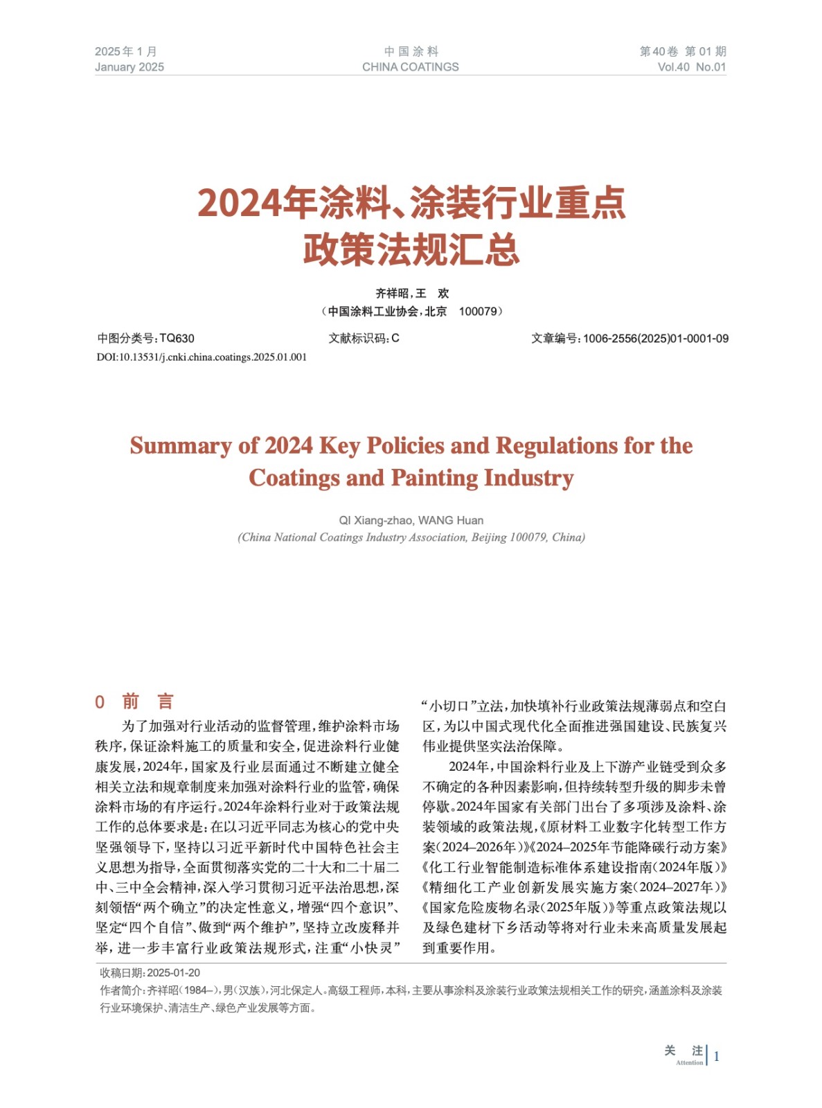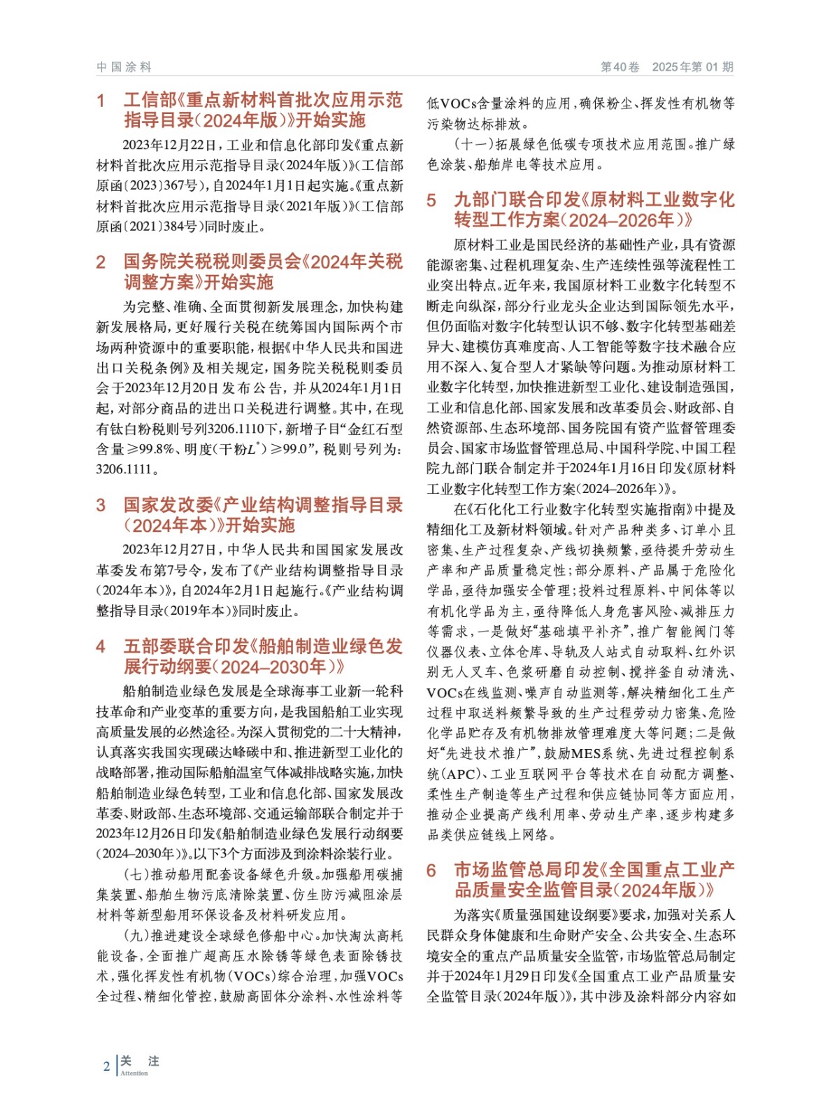 摘要:編者按:2024年,中國涂料行業及上下游產業鏈受到眾多不確定的各種因素影響,但持續轉型升級的腳步未曾停歇。2024年國家有關部門出臺了多項涉及涂料、涂裝領域的政策法規,《原材料工業數字化轉型工作方案(2024–2026年)》《2024–2025年節能降碳行動方案》《化工行業智能制造標準體系建設指南(2024年版)》《精細化工產業創新發展實施方案(2024–2027年)》《國家危險廢物名錄(2025年版)》等重點政策法規以及綠色建材下鄉活動等將對行業未來高質量發展起到重要作用。