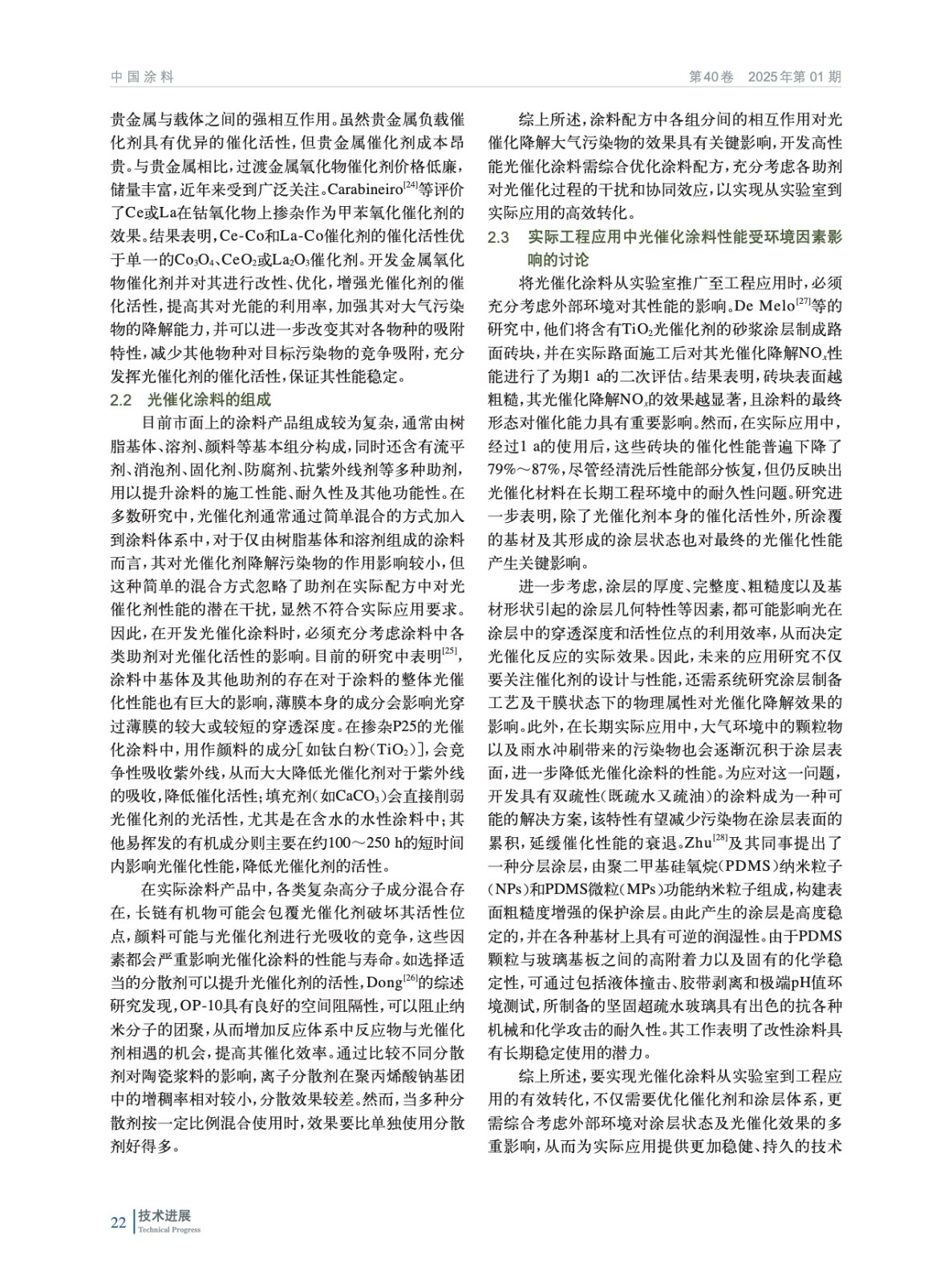 摘要:綜述了光催化涂料的研究進(jìn)展,探討了涂料的光催化基本原理、關(guān)鍵光催化材料的性能,以及通過元素?fù)诫s和半導(dǎo)體復(fù)合等手段提高光催化效率的策略。探討了光催化涂料中的非本征和本征因素影響光催化涂料的性能,包括涂料配方、測試環(huán)境、涂層物理狀態(tài)和外部環(huán)境因素等。研究表明,盡管光催化涂料在控制條件下顯示出較高的污染物降解效率,但在實(shí)際環(huán)境中應(yīng)用時(shí),其性能受到多種因素的影響,包括復(fù)雜的環(huán)境條件和長期穩(wěn)定性的挑戰(zhàn)。未來的研究應(yīng)專注于解決光催化涂料在實(shí)際應(yīng)用中遇到的挑戰(zhàn),包括提高材料對(duì)可見光的響應(yīng)能力,優(yōu)化涂料配方以減少助劑的負(fù)面影響,以及增強(qiáng)涂料的環(huán)境適應(yīng)性和耐用性。此外,更深入地研究光催化涂料在實(shí)際環(huán)境中的性能,特別是在多污染物共存和不同氣候條件下的表現(xiàn),將對(duì)其商業(yè)化應(yīng)用至關(guān)重要。