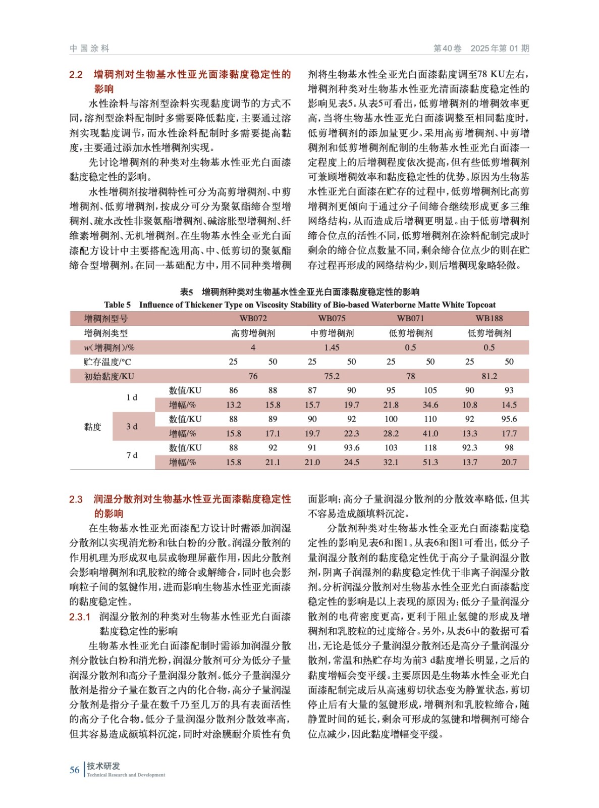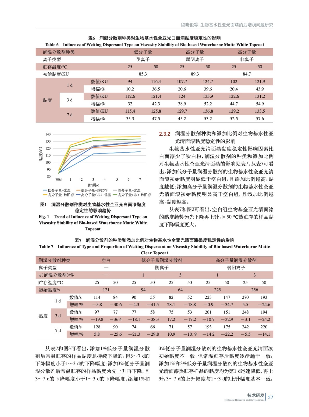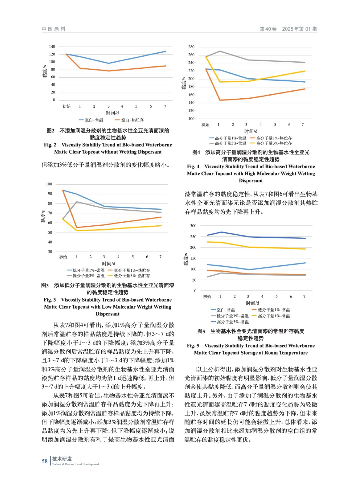 摘要:分析了消光粉、增稠劑、分散劑的種類和添加比例以及分散劑的添加方式對生物基水性亞光面漆黏度穩定性的影響規律。研究表明,生物基水性亞光白面漆在貯存過程中的后增稠現象比生物基水性亞光清面漆更明顯,說明鈦白粉和消光粉的協同作用會明顯增強后增稠現象,而生物基水性亞光清面漆在貯存過程中多存在黏度先下降再上升的現象。高溫貯存會加速其后增稠;消光粉添加比例越高后增稠越明顯;采用高剪、中剪和低剪增稠劑配制的生物基水性亞光白面漆一定程度上的后增稠程度依次提高,但有些低剪增稠劑兼顧增稠效率和黏度穩定性的優勢。低分子量潤濕分散劑的黏度穩定性優于高分子量潤濕分散劑,陰離子潤濕劑的黏度穩定性優于非離子潤濕分散劑。