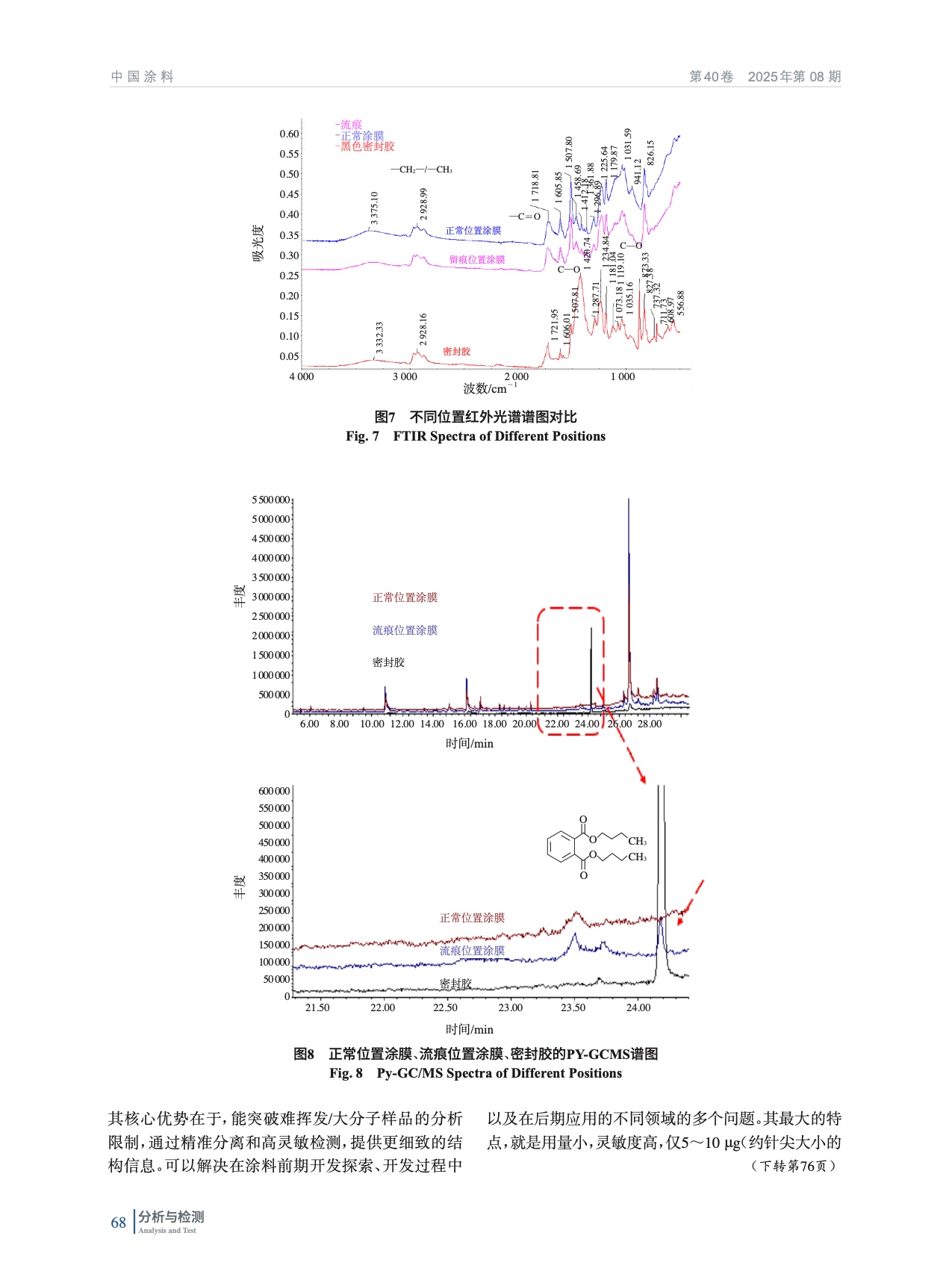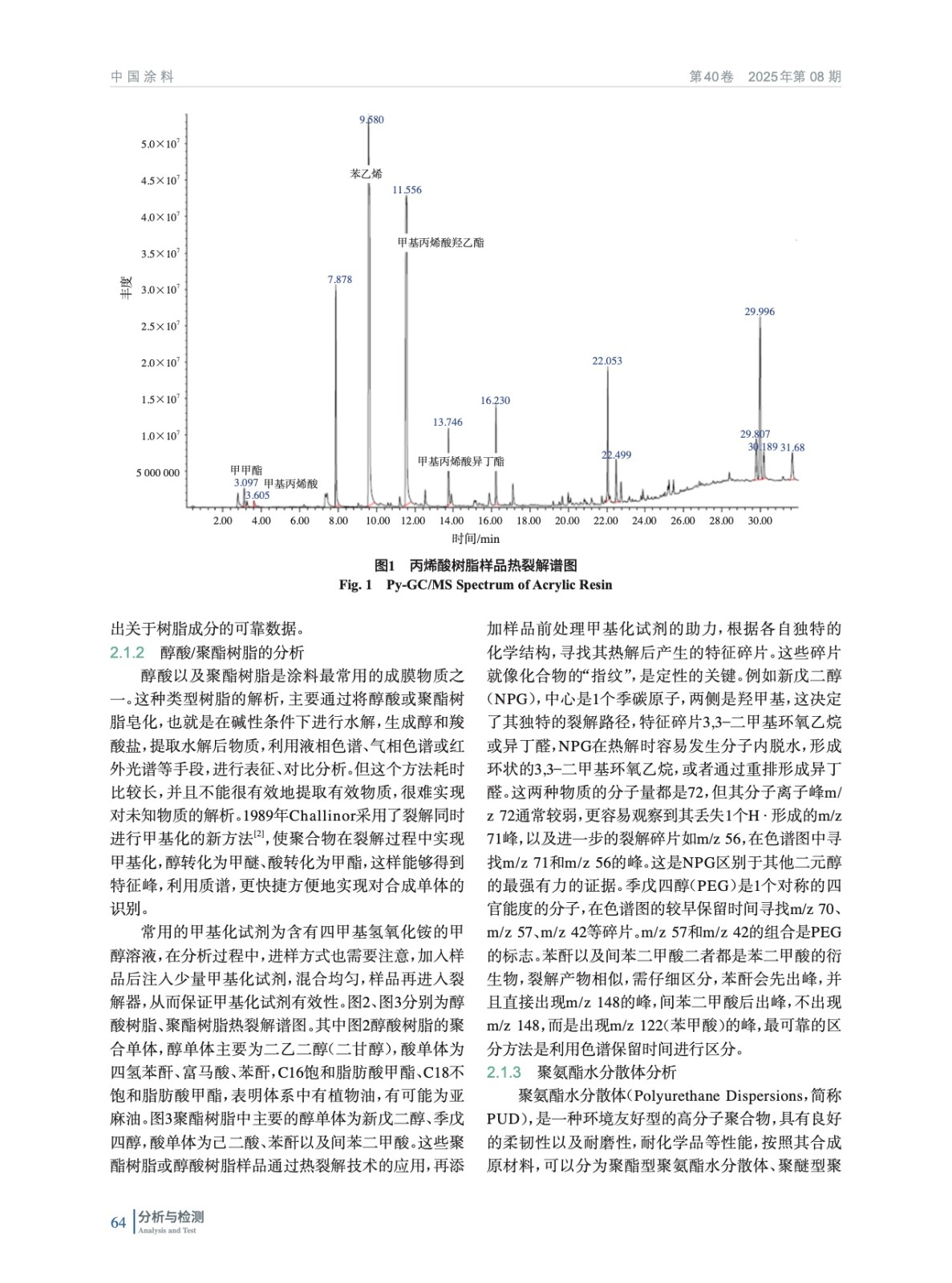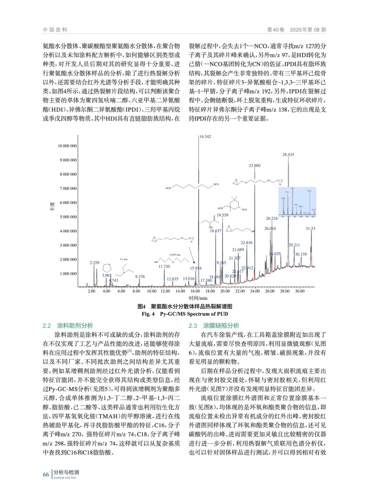 探討了熱裂解氣質聯用色譜(Py-GC/MS)技術在涂料成分解析以及涂膜缺陷分析中的應用,其可分析涂料及原材料的類型、相關單體,另外也可根據裂解碎片得到結構指向,針對涂膜表面缺陷以及涂料現場應用問題進行快速分析與解決。