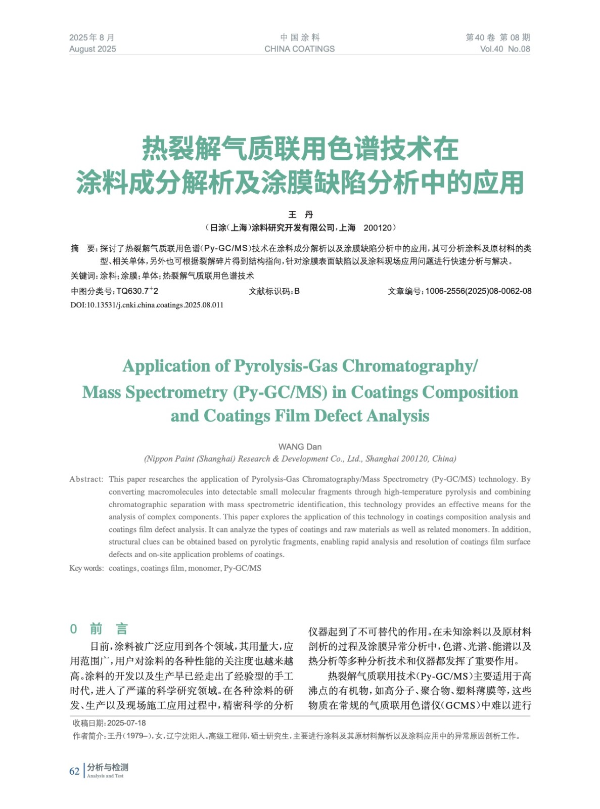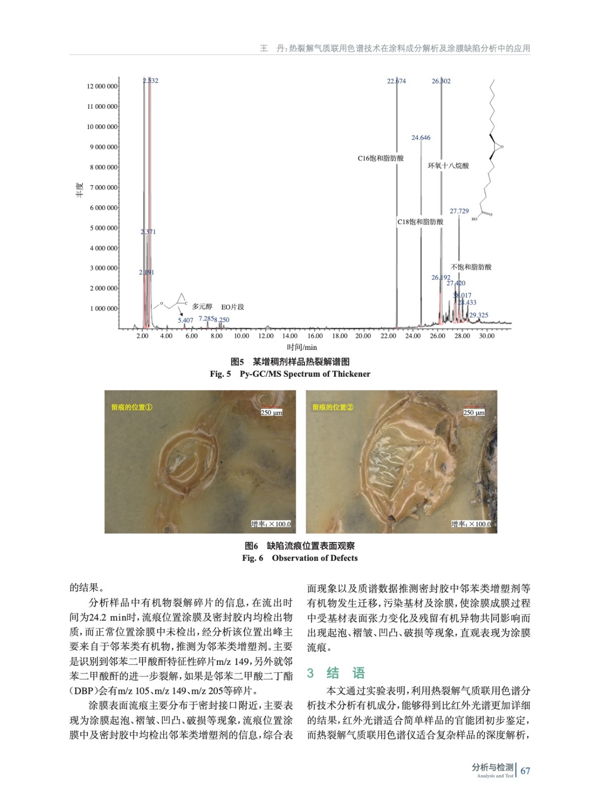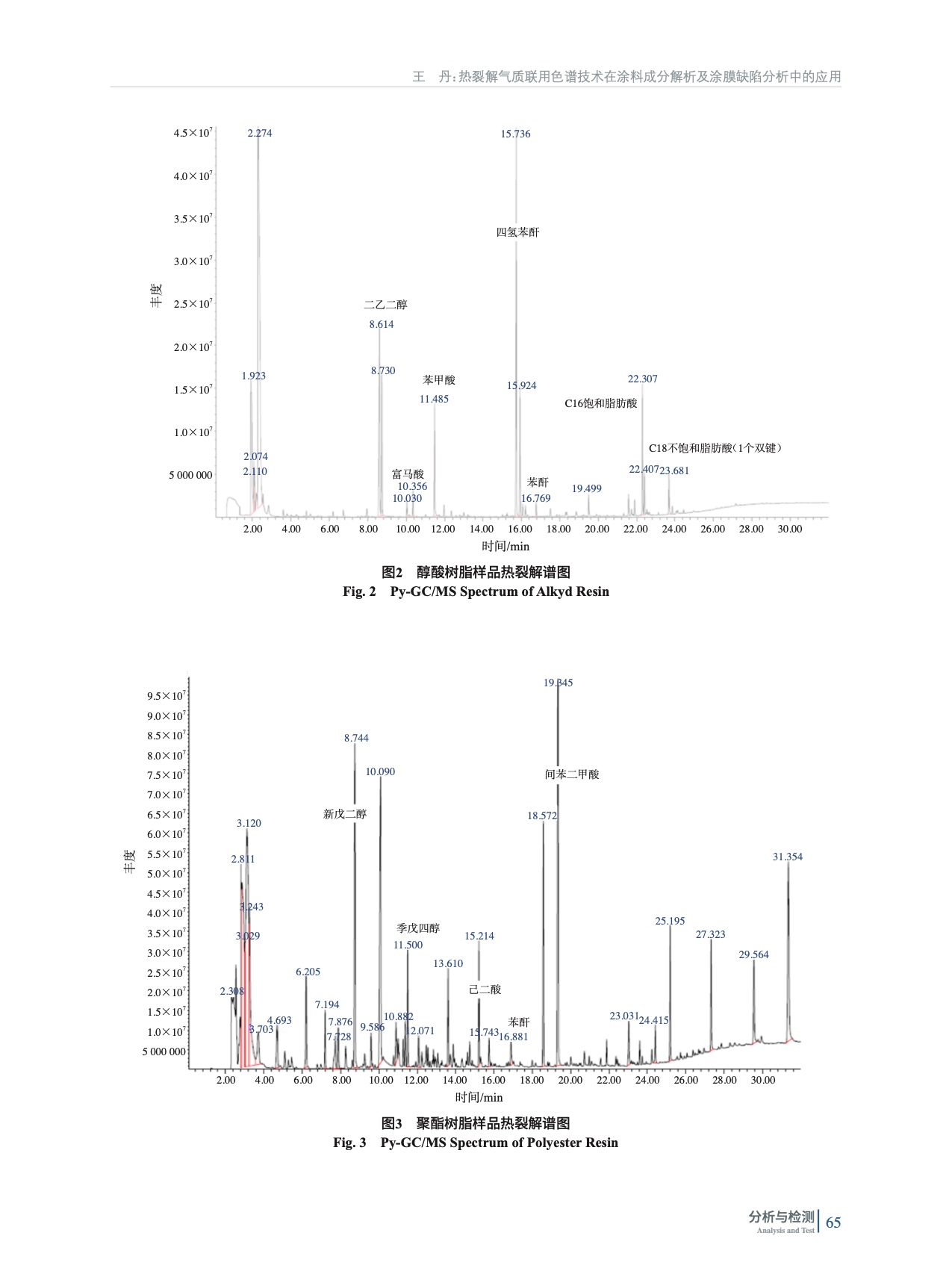 探討了熱裂解氣質聯用色譜(Py-GC/MS)技術在涂料成分解析以及涂膜缺陷分析中的應用,其可分析涂料及原材料的類型、相關單體,另外也可根據裂解碎片得到結構指向,針對涂膜表面缺陷以及涂料現場應用問題進行快速分析與解決。
