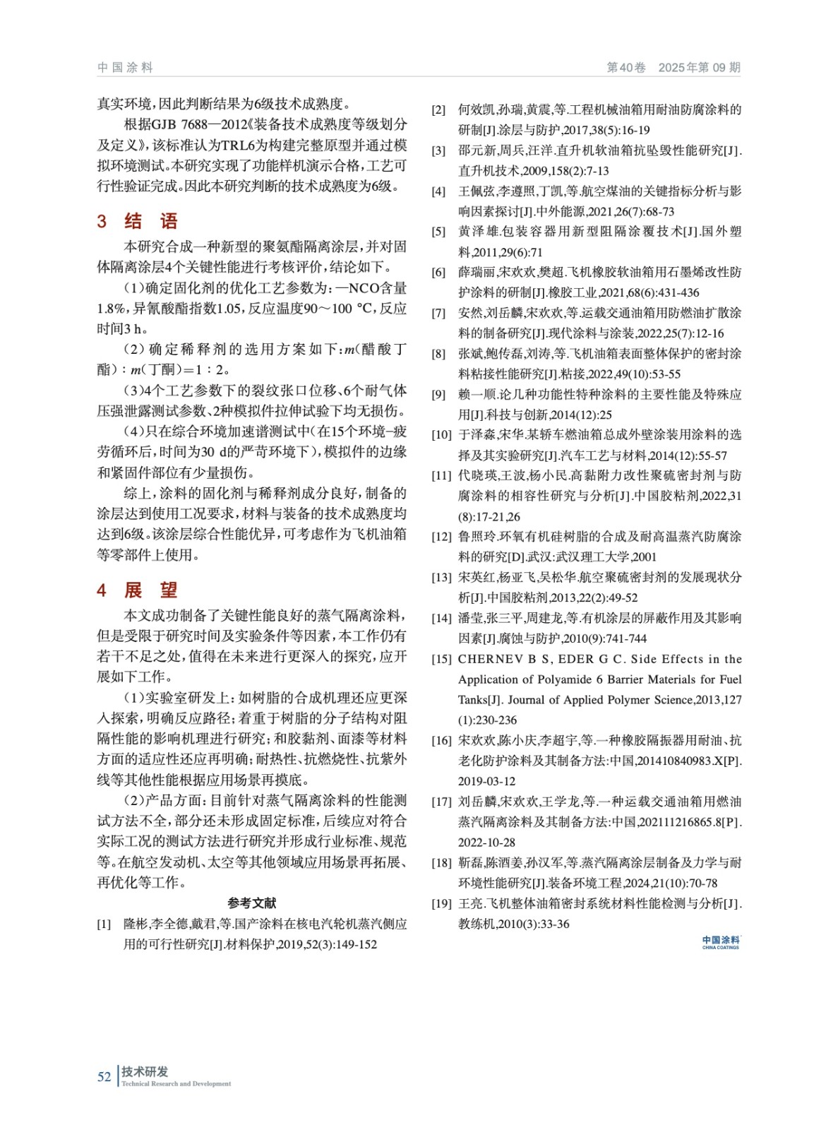摘要:本研究主要探索聚氨酯改性隔離涂料中的固化劑與稀釋劑組分對涂層的影響規律,獲得較為優良的固化劑與稀釋劑配方,—NCO含量1.8%(質量分數,后同),異氰酸酯指數1.05,m(醋酸丁酯)∶m(丁酮)=1∶2,制備參數為反應溫度90~100 ℃,反應時間3 h。然后制備并測試涂層,主要從裂紋張口位移、耐氣體壓強泄露、模擬件拉伸、綜合環境加速譜試驗4方面進行測試,最后對性能進行綜合評價。結果表明,只在綜合環境加速譜中(15個環境?疲勞循環后)的邊緣和2個緊固件部位有少量損傷,總體看4項關鍵性能良好,說明該涂層固化劑與稀釋劑的設計方案較好,可作為航空飛行器油箱隔離涂層使用。