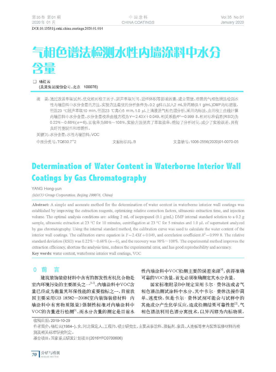 通過改善萃取試劑、優化相對校正因子、超聲萃取時間、進樣體積等影響因素,建立簡便、準確的氣相色譜法檢測水性內墻涂料中水分含量的方法。該實驗方法提高了萃取效率,縮短了分析時間,減少了實驗誤差,具有良好的重現性和準確性。