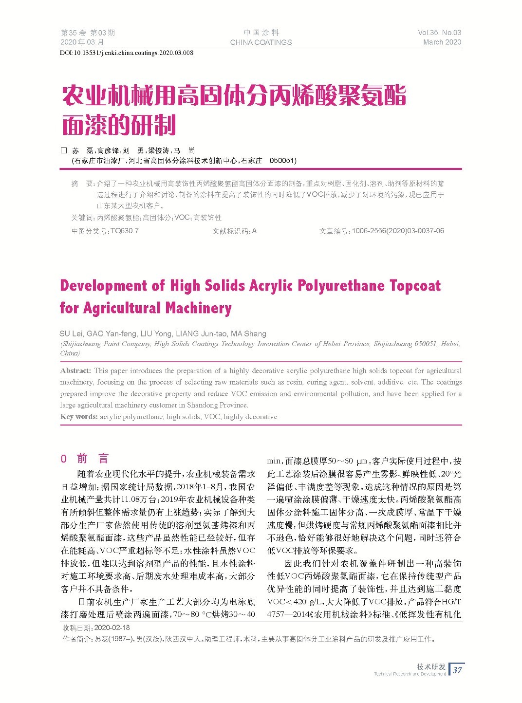 農業機械用高固體分丙烯酸聚氨酯面漆的研制