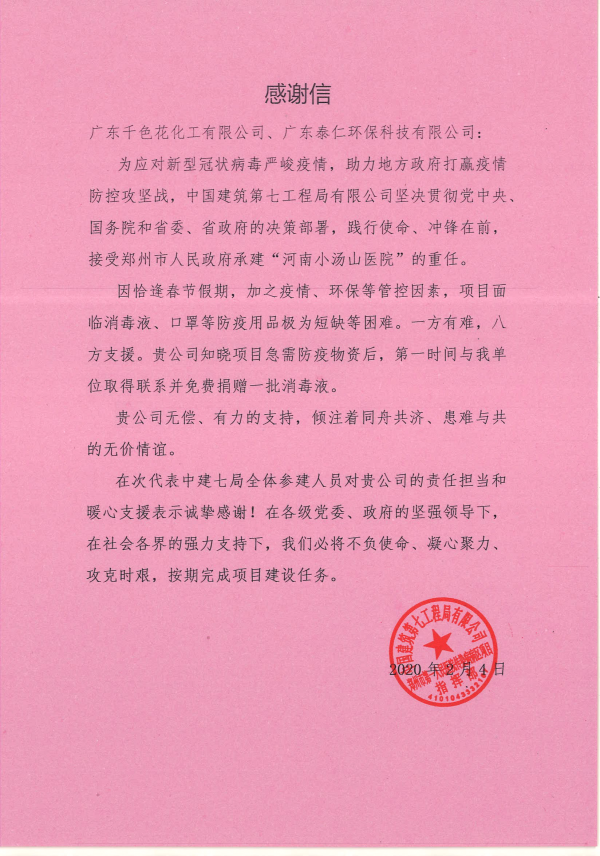 因恰逢春節(jié)假期,加之疫情、環(huán)保等管控因素,項目面臨消毒液、口罩等防疫用品極為短缺等困難。一方有難,八方支援。廣東千色花化工有限公司、廣東泰仁環(huán)保科技有限公司知曉項目急需防疫物資后,第一時間與承建單位取得聯(lián)系并免費捐贈批消毒液。