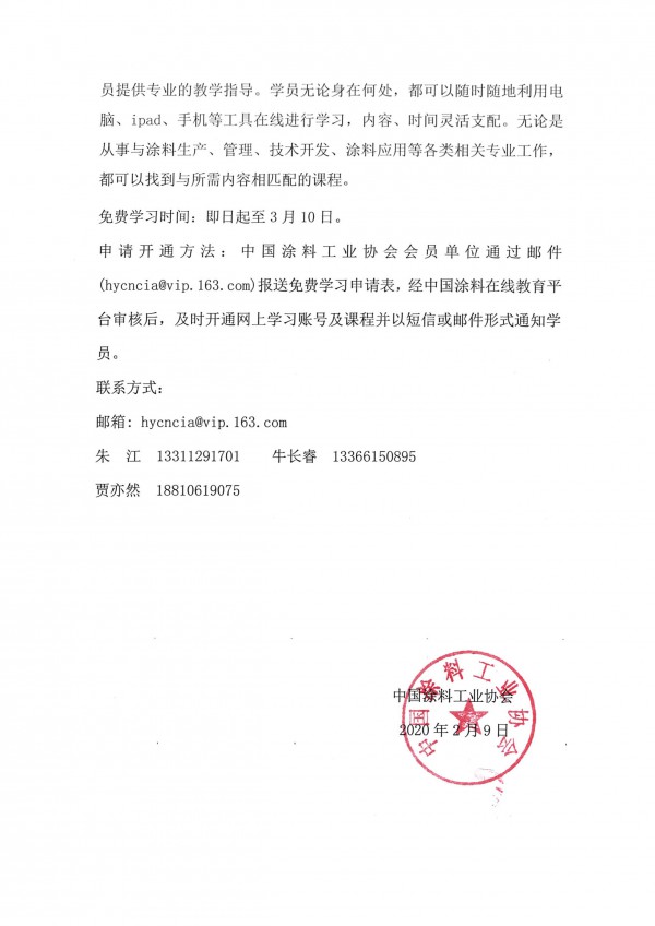 申請(qǐng)開(kāi)通方法:中國(guó)涂料工業(yè)協(xié)會(huì)會(huì)員單位通過(guò)郵件(hycncia@vip.163.com)報(bào)送免費(fèi)學(xué)習(xí)申請(qǐng)表,經(jīng)中國(guó)涂料在線教育平臺(tái)審核后,及時(shí)開(kāi)通網(wǎng)上學(xué)習(xí)賬號(hào)及課程并以短信或郵件形式通知學(xué)員。