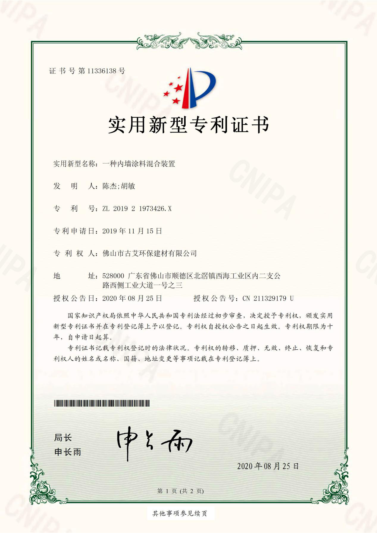 近日,經國家知識產權局評定,我公司榮獲多項專利證書,“一種瓷磚粘接劑注射設備”、“一種利于砂漿膠儲存的儲存裝置”、“一種用于裝飾內墻涂料的運輸裝置”、“一種砂漿膠的存儲設備”、“一種涂料墻縫隙防水注膠裝置”、“一種內墻涂料混合裝置”、“一種界面劑定量灌裝裝置”、“一種防水涂料生產用攪拌裝置”。這標志企業在研發創新方面又步入一個新臺階!