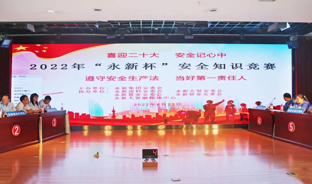 2022年6月22日,由公司安委會舉辦的“喜迎二十大,安全記心中”“永新杯”安全知識競賽在九樓多功能廳舉行。來自公司機關、永新涂料、永新大貿、永新置業、永新管業共6支參賽隊參賽。舉辦此次活動旨在強化全員安全紅線意識,普及安全知識,提高安全素養,推動公司安全文化建設,提高落實主體責任的能力。