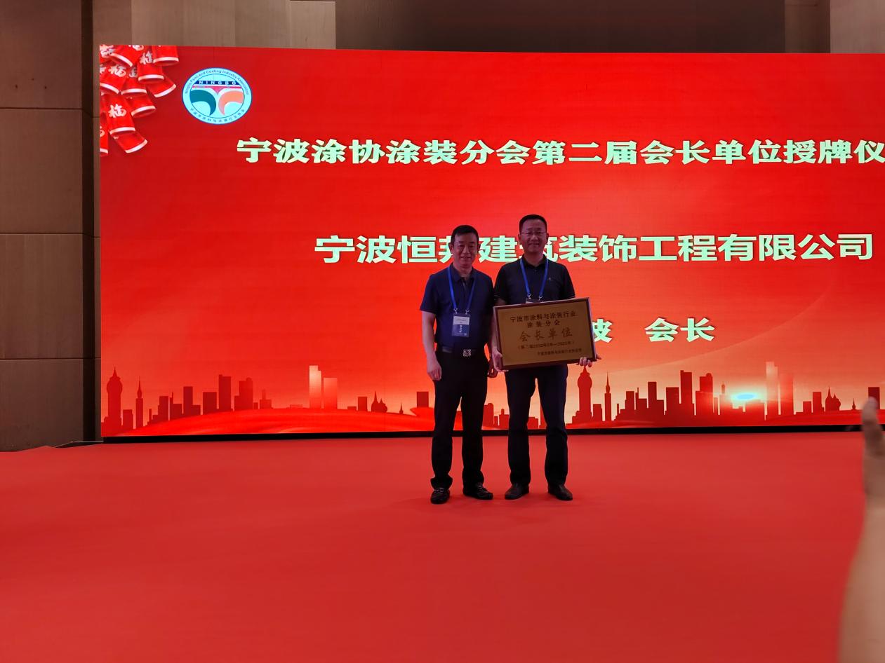 汪立波會(huì)長(zhǎng)為當(dāng)選寧波市涂料與涂裝行業(yè)協(xié)會(huì)涂裝分會(huì)第二屆會(huì)長(zhǎng)單位及會(huì)長(zhǎng)——寧波恒邦建筑裝飾工程有限公司李世良總經(jīng)理授牌。