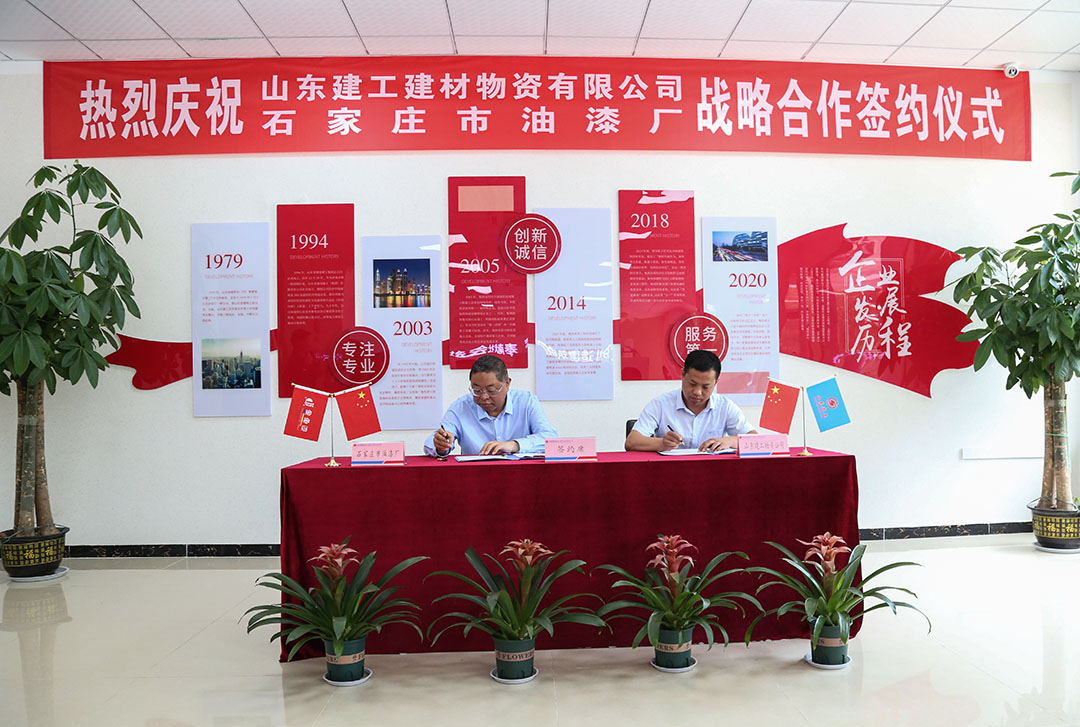 石家莊市油漆廠董事長焦亞平、山東建工建材物資有限公司董事長任俊生,代表雙方簽約。標志著雙方合作正式邁出了關(guān)鍵一步。