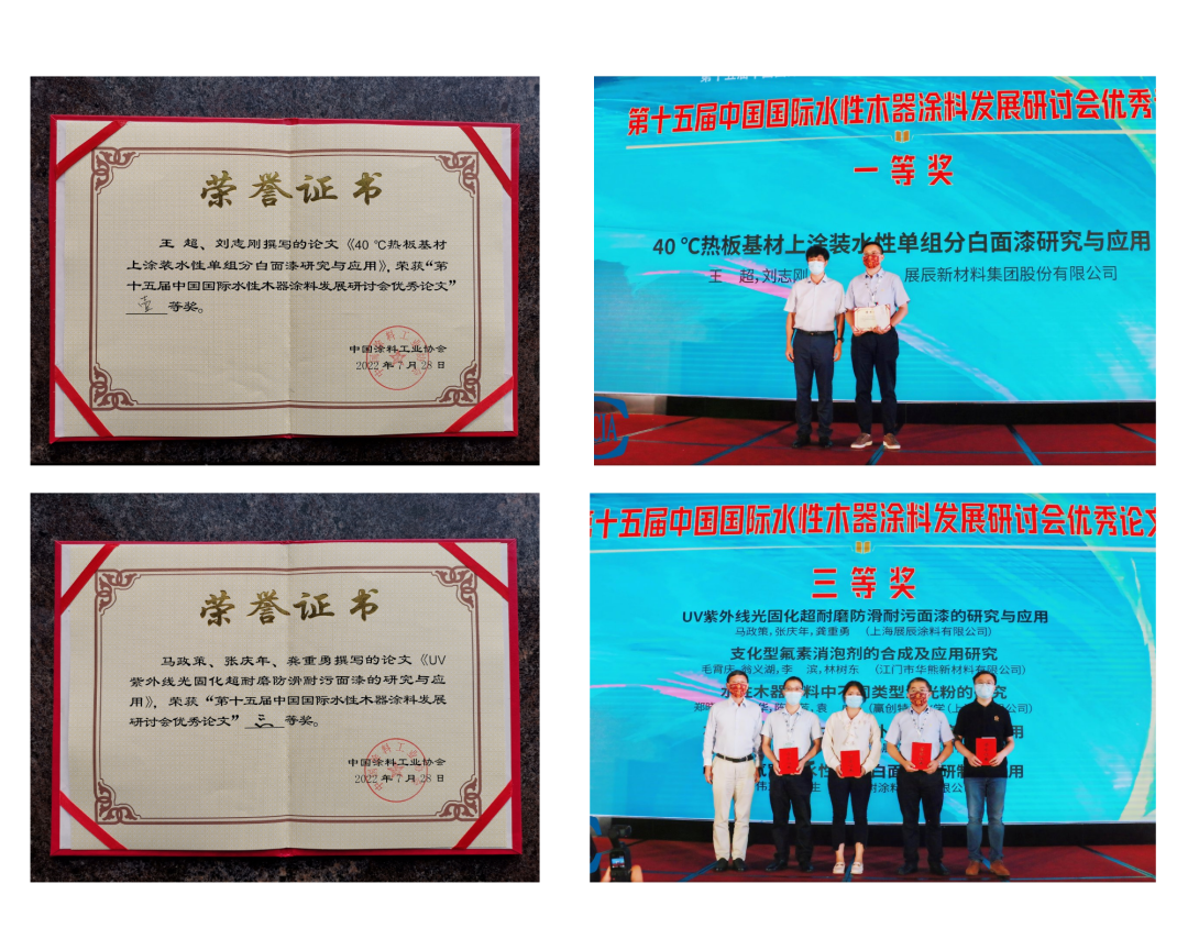 本次大會還對優秀水性涂料學術論文進行評選和表彰,展辰依然體現出強大的技術創新能力及共同發展的分享精神,獲得優秀論文一等獎及三等獎。