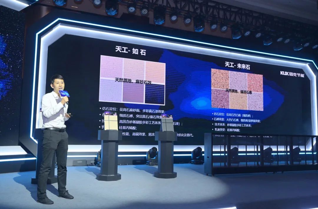 活動開場,固克節能CSO/CCO慕武威先生簡要詮釋了此次發布會的活動主題與新品大致理念,這兩項品牌新品均承襲全新易涂設計理念研發投入:天工如石作為一款特色超仿石涂料,以“天工如石面漆”為主導材料、最新凝膠多彩技術為基礎,科學融合了水包水、水包砂、真石漆三大工藝體系研發而成。
