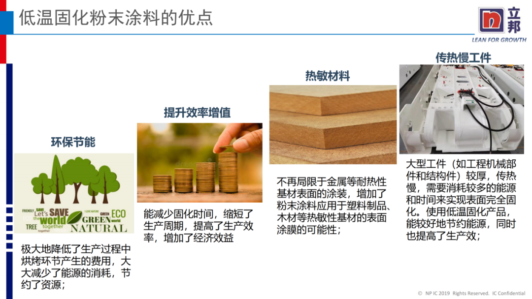據伍總介紹,低溫粉末涂料綜合優勢是近零VOCs排放,生產及使用全過程沒有有機溶劑揮發,沒有氮氧化物產生,可滿足最嚴格的環保要求。倘若低溫粉末涂裝工藝固化溫度在90-120度,熱風固化時間10-15分鐘,紅外固化3-5分鐘。這是傳統粉末涂料涂裝能耗的50%,可實現全電氣化涂裝,經濟效益顯著。