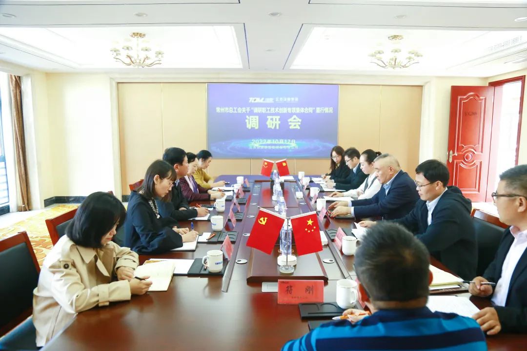金風送爽,秋色宜人,在黨的二十大勝利召開之際,10月17日下午,在區總工會副主席人社局副局長劉建華陪同下,常州市總工會集體協商專家王延花、奚志英等一行走訪了江蘇湯姆集團,并召開了關于“職工技術創新專項集體合同”履行情況調研會。