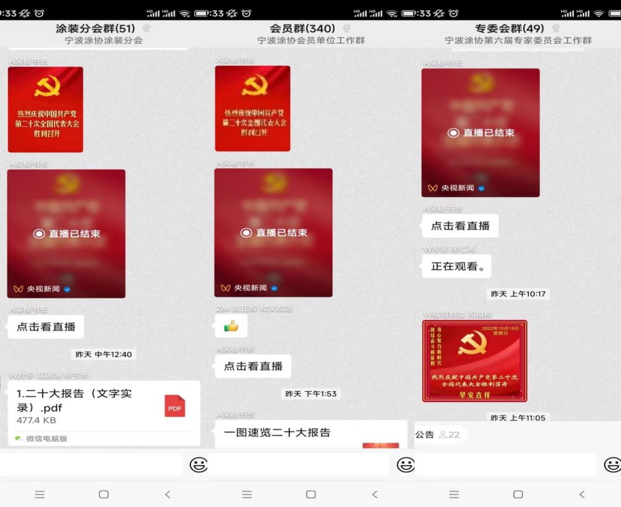 為深入貫徹學習黨的二十大會議精神,進一步筑牢信仰之基、補足精神之鈣、把穩思想之舵,團結引領廣大黨員堅定跟黨走、建功新時代。寧波涂協組織全體黨員、入黨積極分子和秘書處全體工作人員滿懷激動的心情專心致志地觀看中國共產黨第二十次全國代表大會直播,同時在各個會員工作群積極發動會員企業組織觀看。