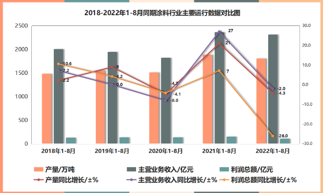 2022年1-8月,我國涂料行業全行業總產量約2259.7萬噸(含規模以下部分),較去年同期同比降低4.3%;主營業務收入總額約2897.6億元,較去年同期同比降低2.0%;利潤總額約141.1億元,較去年同期同比降低26.0%。