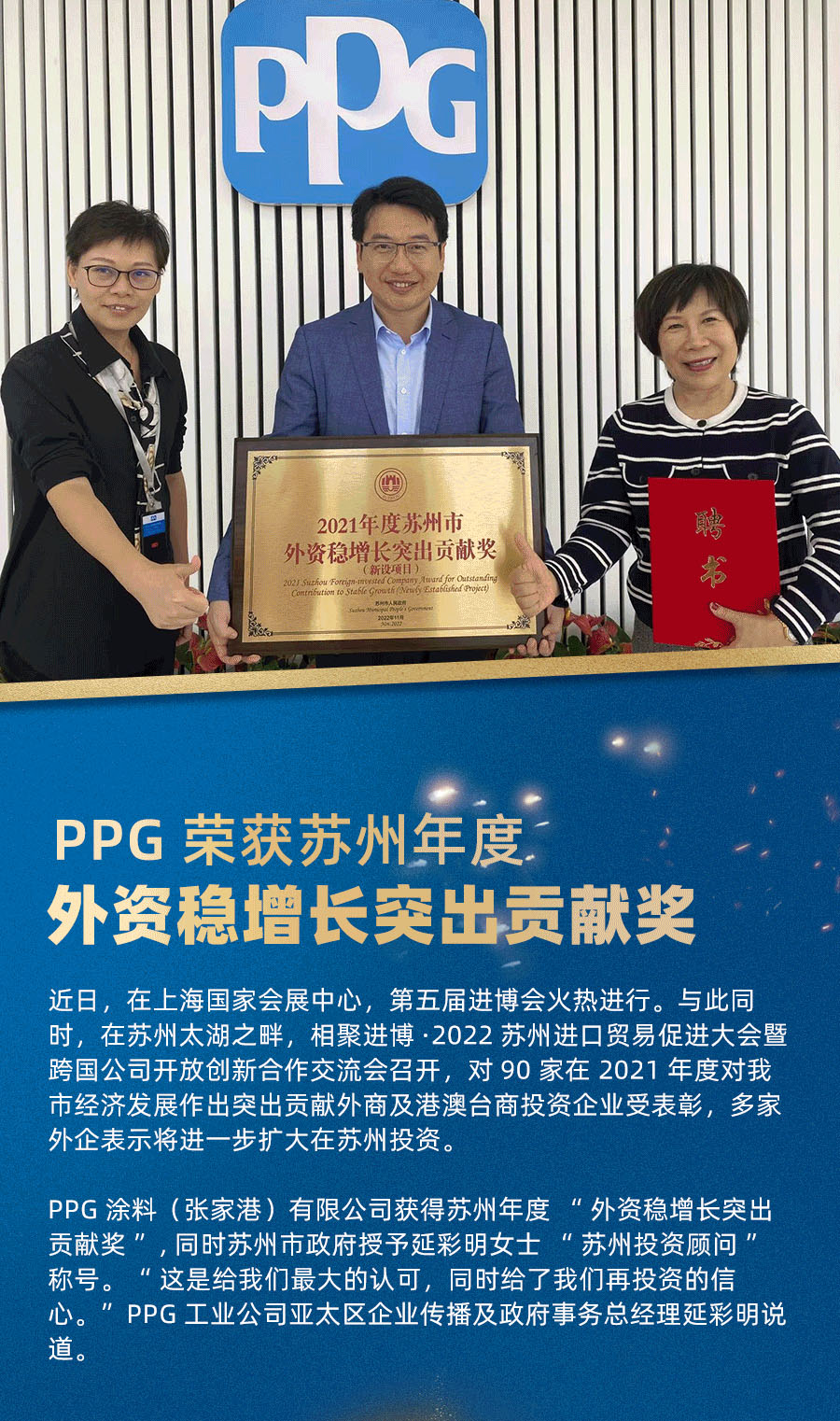 近日,PPG榮獲蘇州年度“外資穩增長突出貢獻獎”。