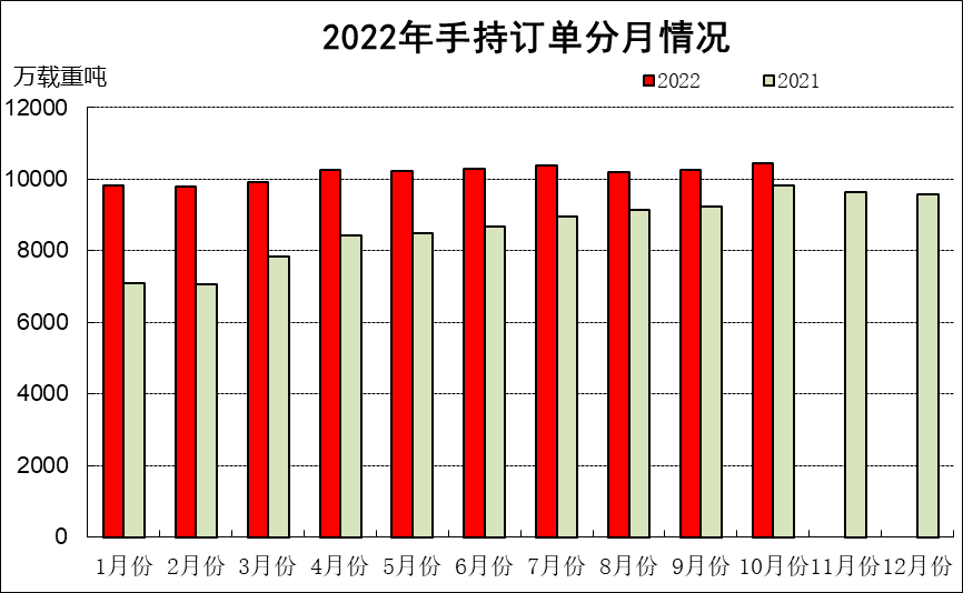 1~10月,50家重點監測的造船企業完工出口船2588萬載重噸,同比下降13.4%;承接出口船訂單3344萬載重噸,同比下降39.3%;10月末手持出口船訂單9334萬載重噸,同比增長8.0%。出口船舶分別占重點造船企業完工量、新接訂單量、手持訂單量的88.5%、94.8%和92.0%。